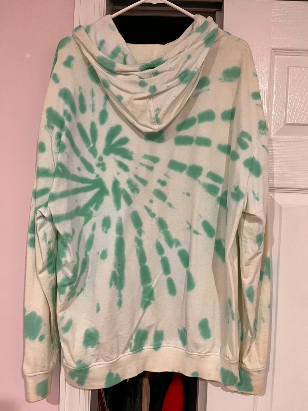 White and green tie-dye hoodie featuring a graphic of Whitney Houston on the front. There is a little stain around the hood because it’s been in my closet for a while but with a little wash it would be all good. Large but is a little big.