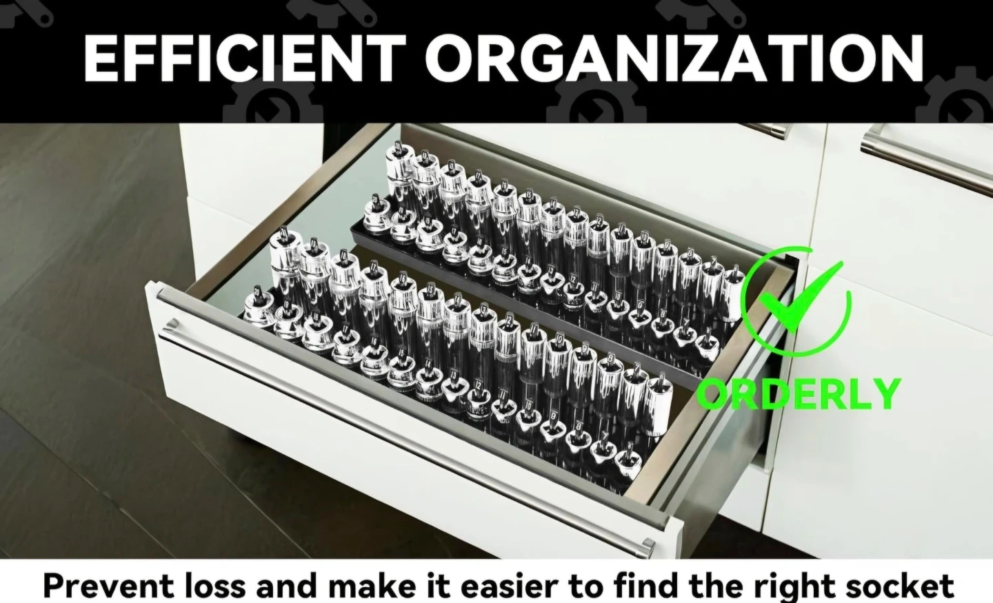 Set of socket organizer trays in red and black. Includes multiple trays for 1/4-inch, 3/8-inch, and 1/2-inch drive sockets, both metric and SAE sizes. Keep your tool drawer tidy and find sockets quickly!
