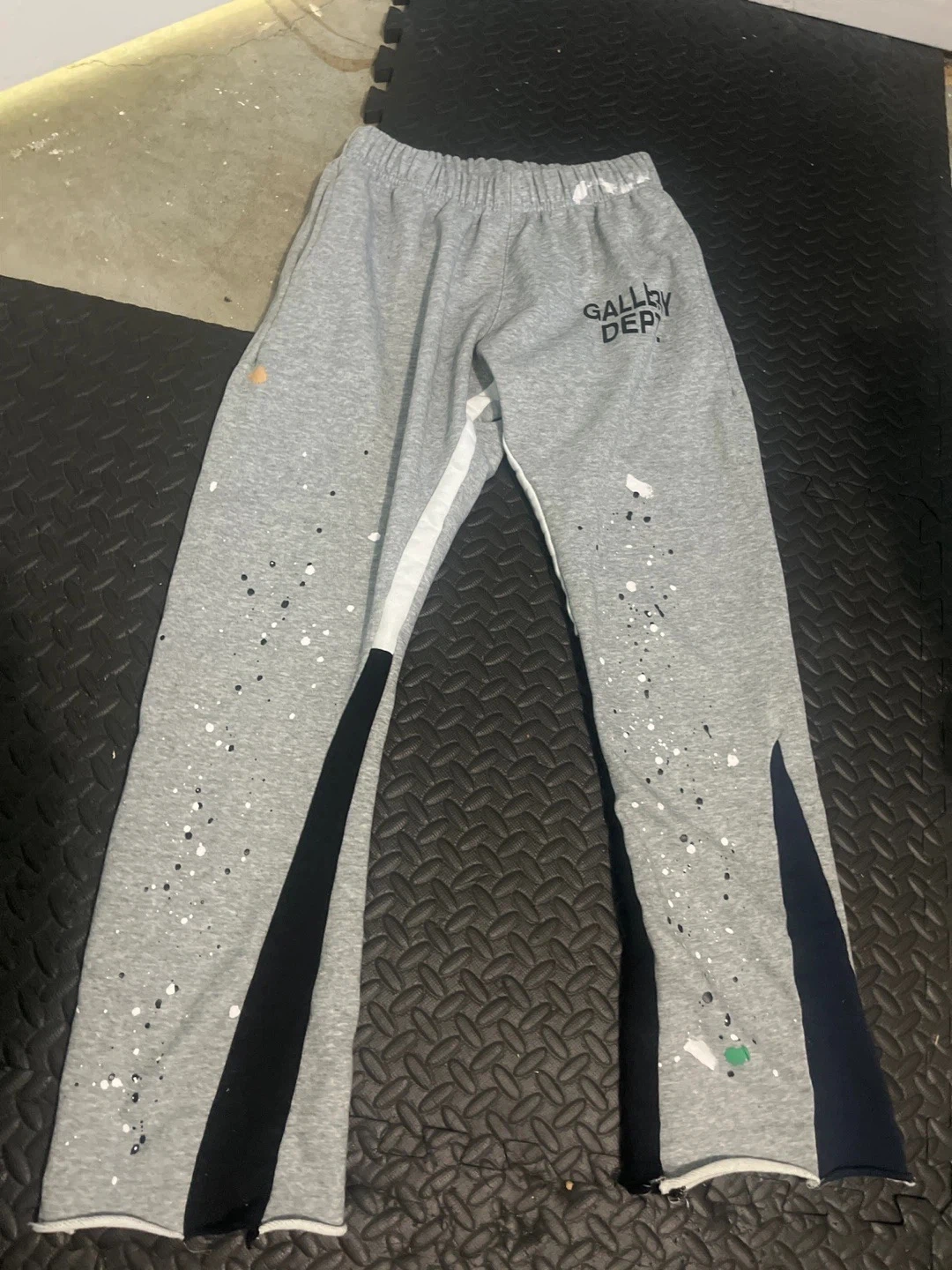 Gallery Dept. grey sweatpants featuring a paint splatter design. These pants have a comfortable, relaxed fit and come with contrasting panels down the legs. Great for casual wear!