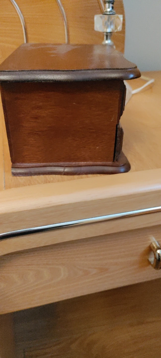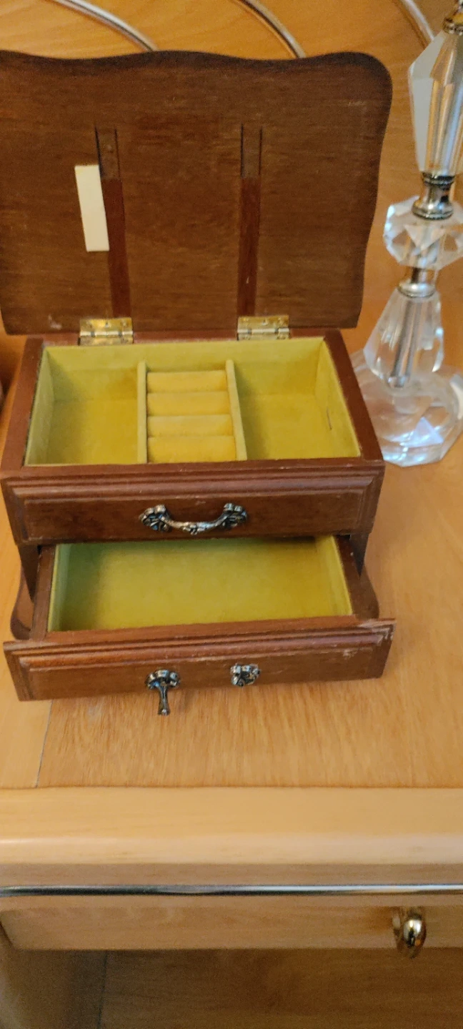 A charming wooden jewelry box with two drawers for storage. It's lined with yellow fabric and features decorative metal pulls. This box is perfect for keeping your favourite trinkets and treasures organized.