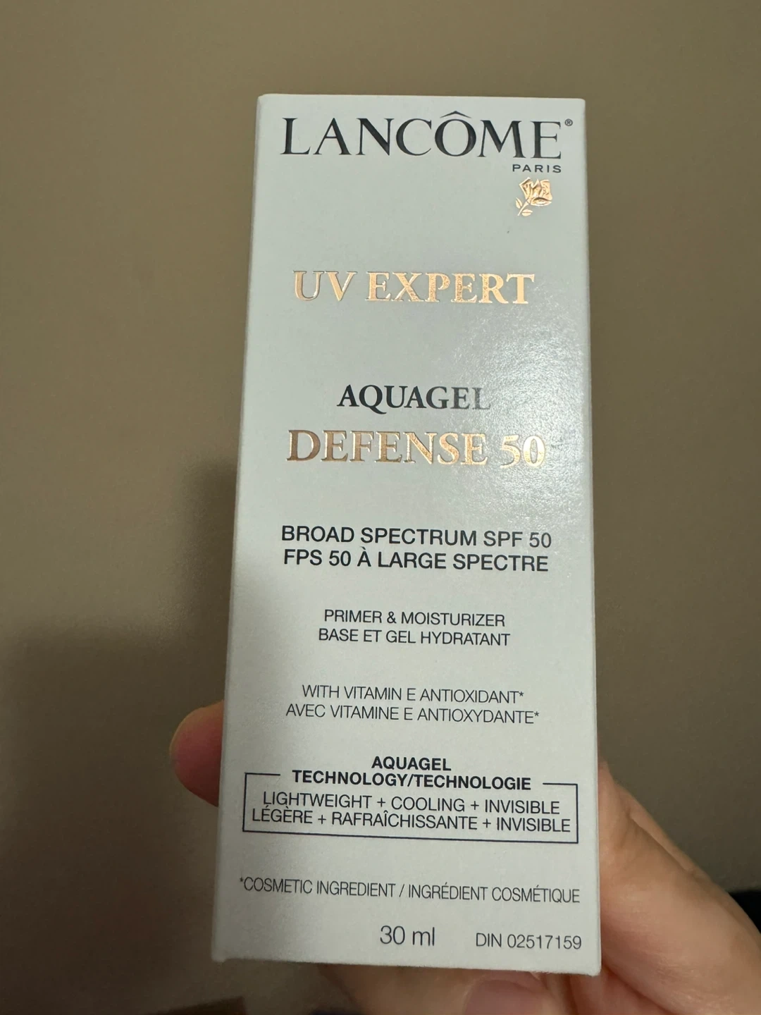 Lancôme UV Expert Aquagel Defense 50 is a broad spectrum SPF 50 sunscreen. It functions as a primer and moisturizer with Vitamin E antioxidant. It's lightweight, cooling, and invisible.