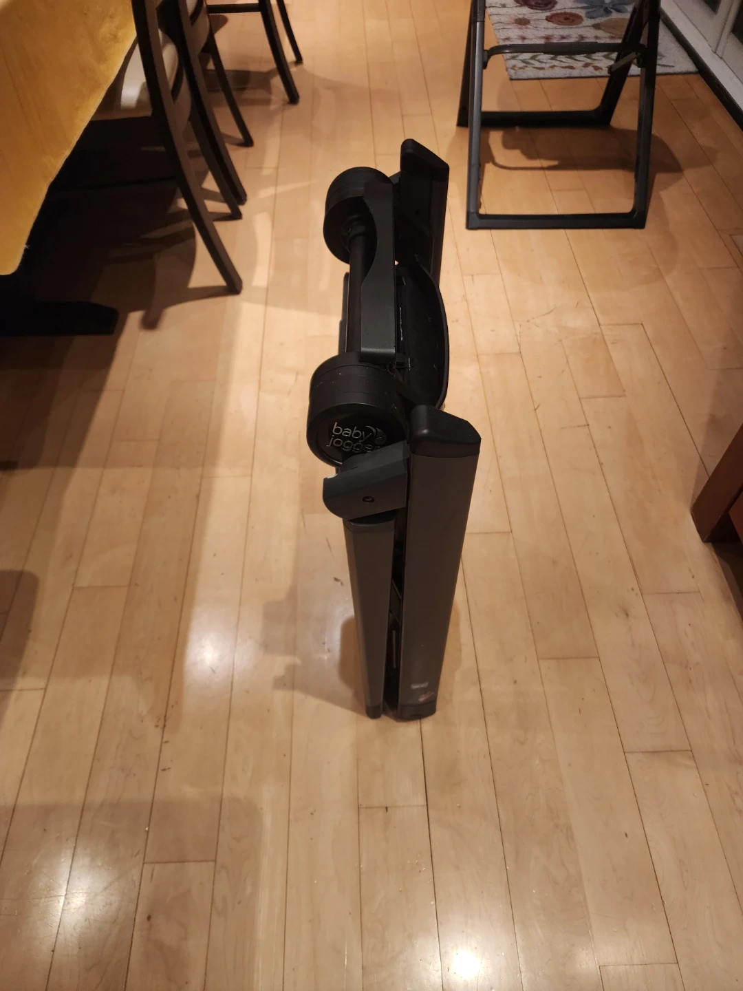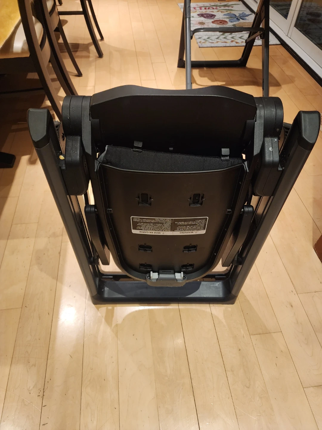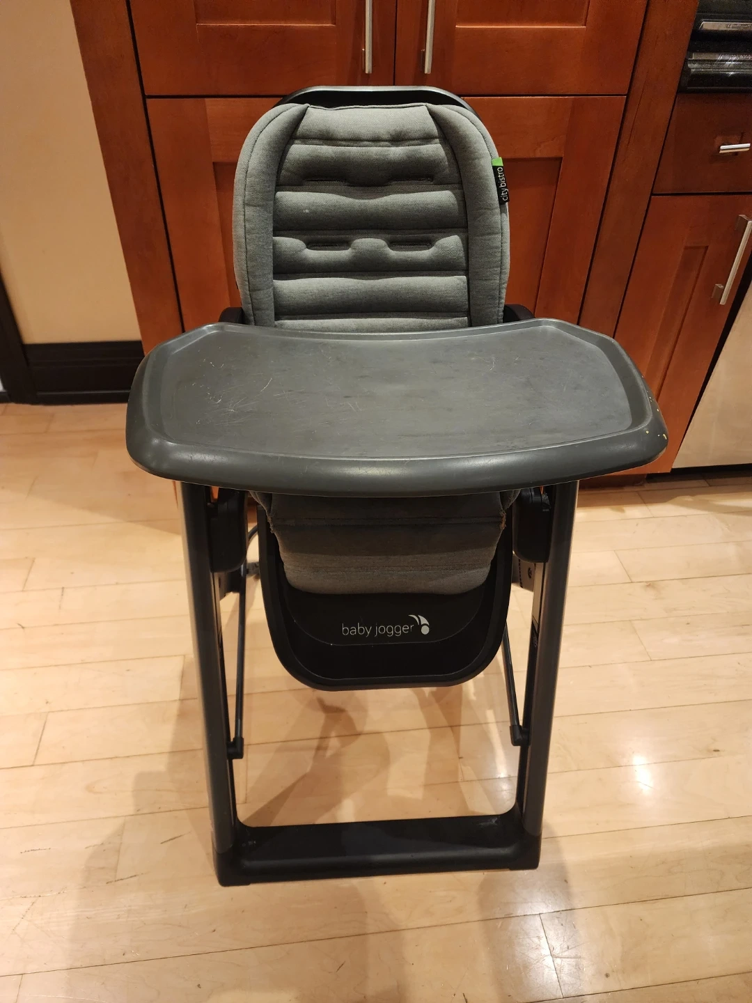 This Baby Jogger City Bistro high chair comes in a grey fabric. It has a removable tray and a fold-up design for easy storage. Its sleek design makes it a great addition to any kitchen.