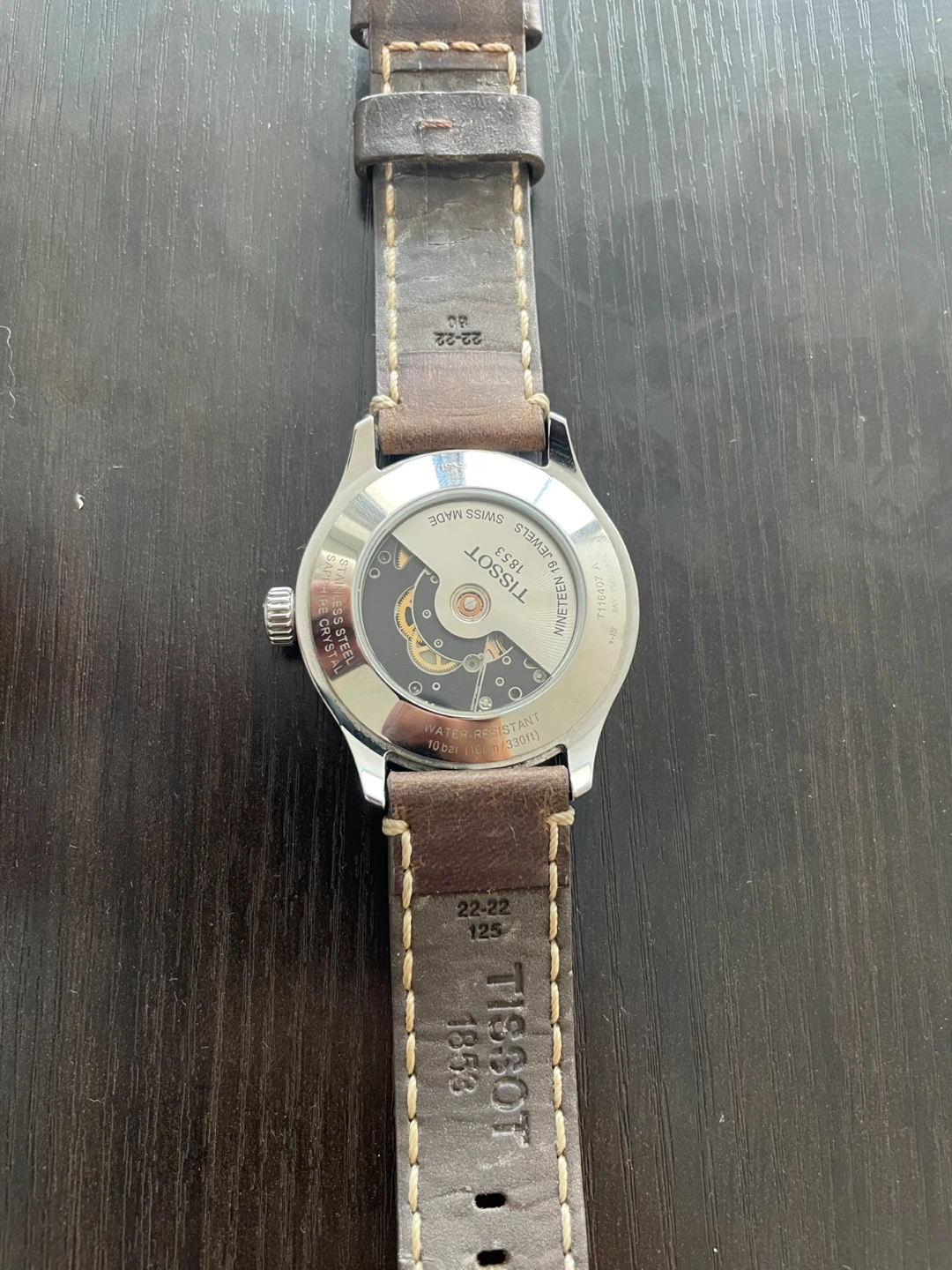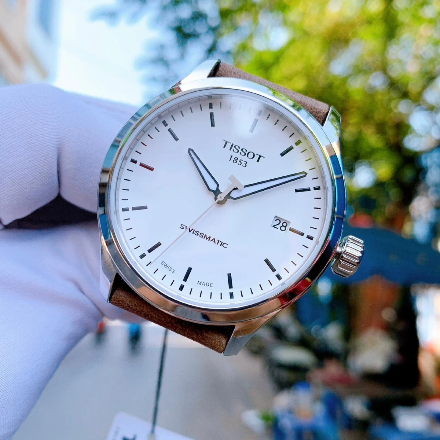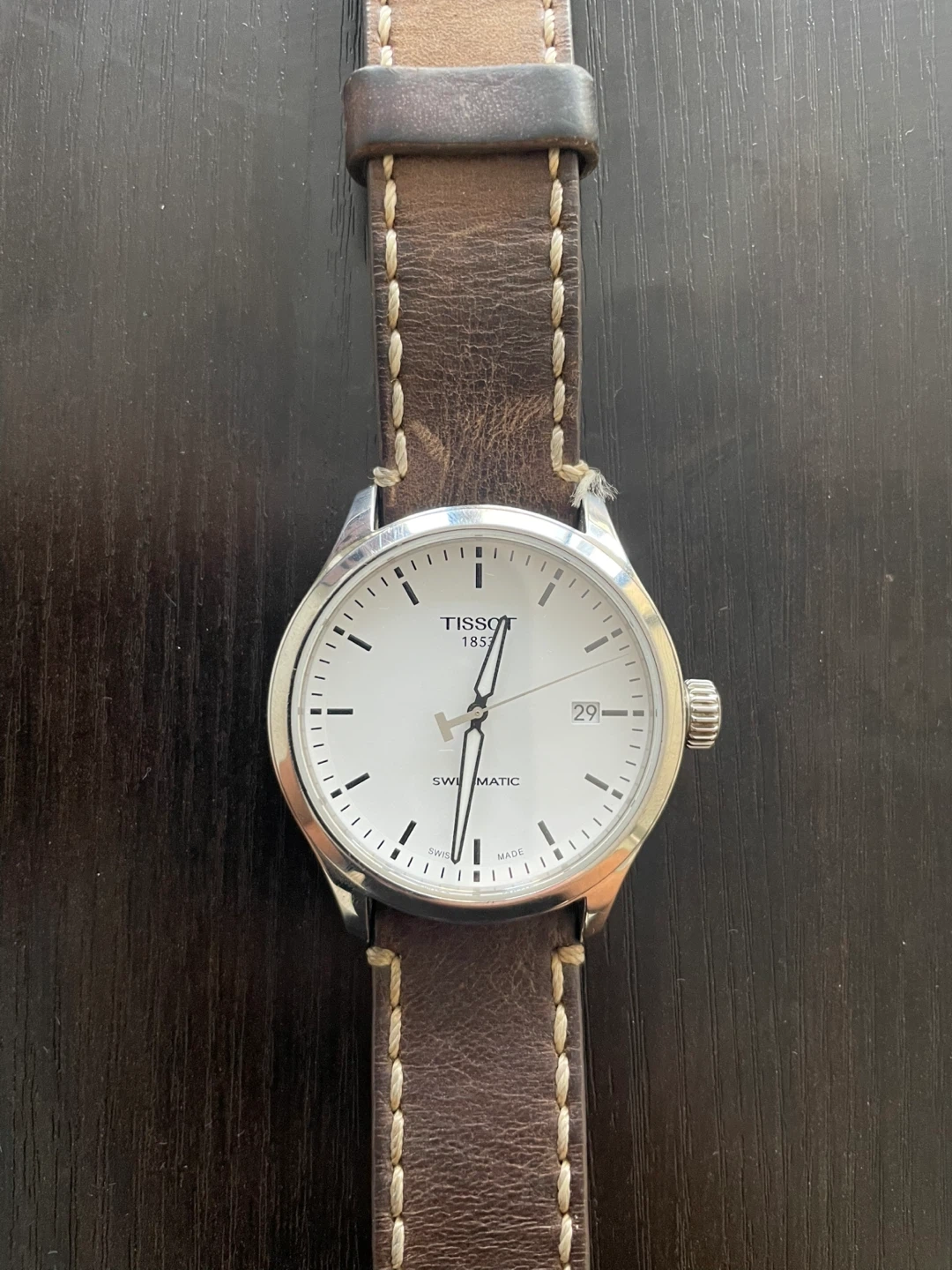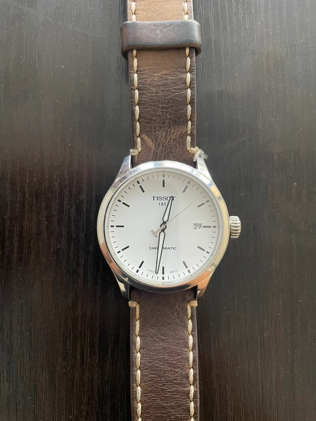 This is a Tissot Swissmatic automatic watch with a white dial and a brown leather strap. It's water-resistant up to 10 bars. This watch is suitable for daily wear and special occasions.
