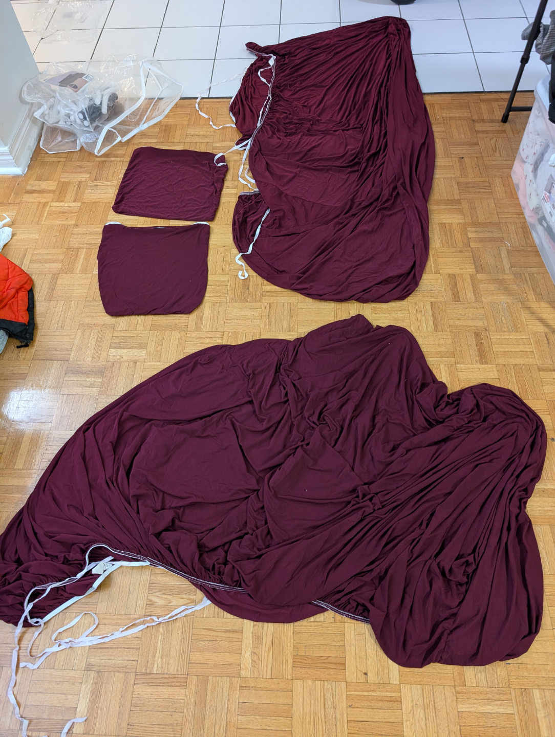 Burgundy fabric in multiple parts. Includes fitted pieces and a main sheet. The set is useful for freshening up the look of your furniture in a calm environment.