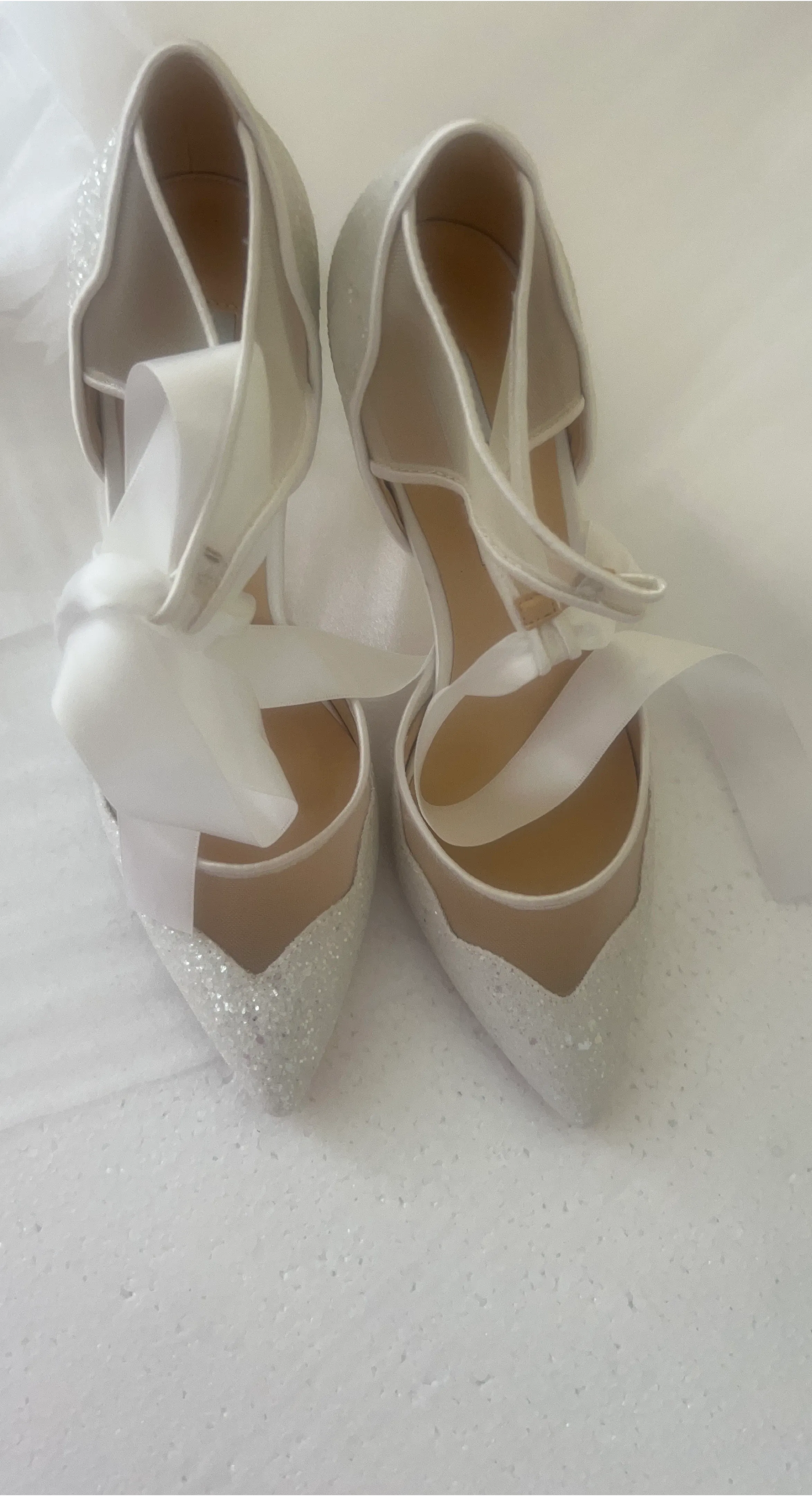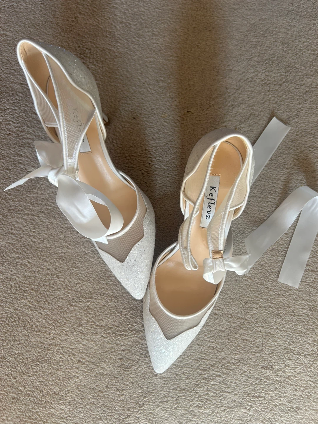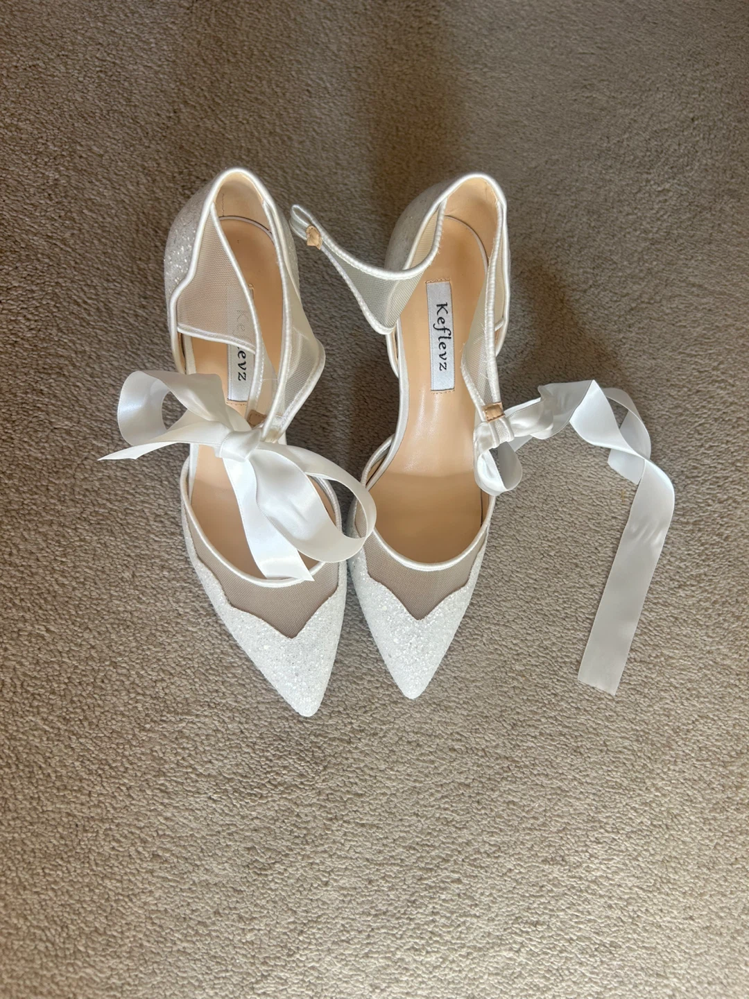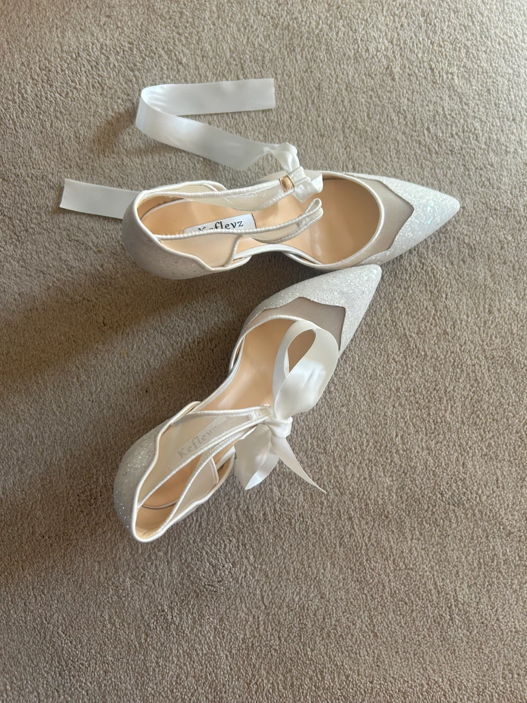 Elegant Keflevz heels in a sparkly white glitter finish. These shoes feature a delicate mesh overlay and a satin ribbon tie that wraps around the ankle. Perfect for weddings or special occasions!