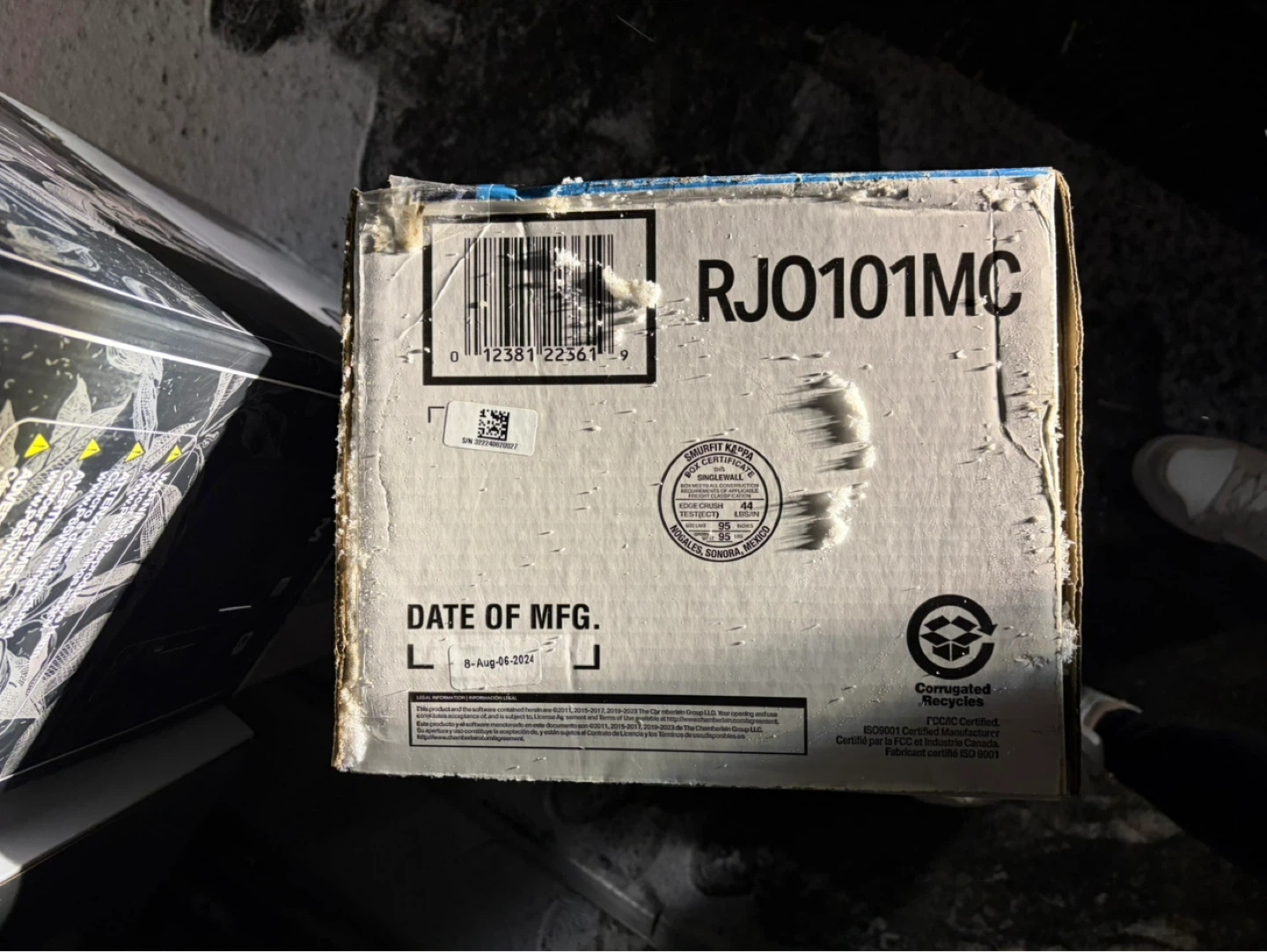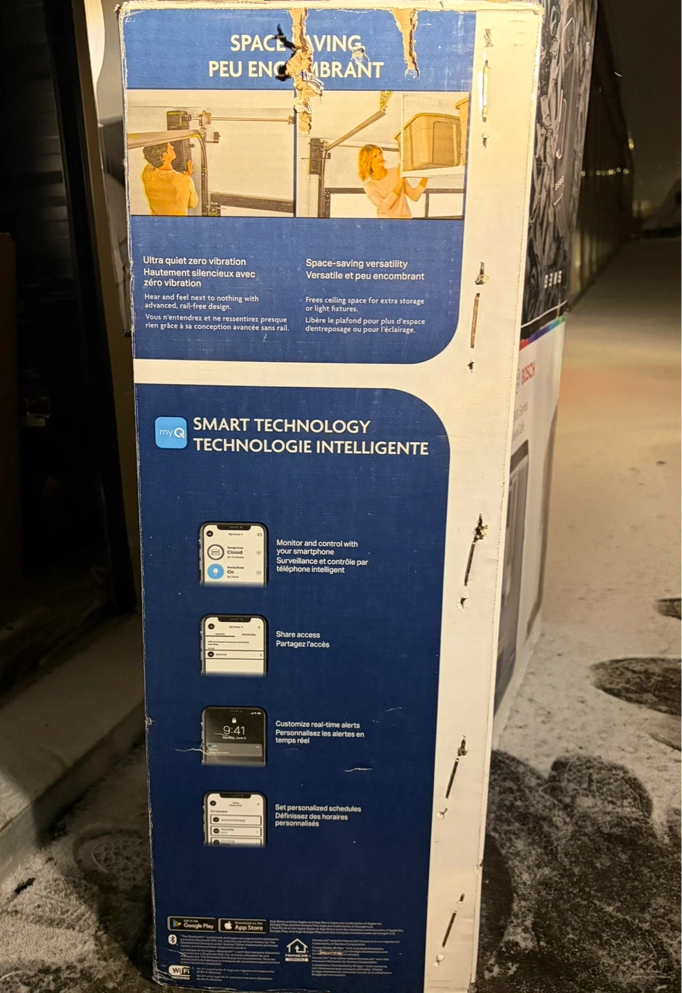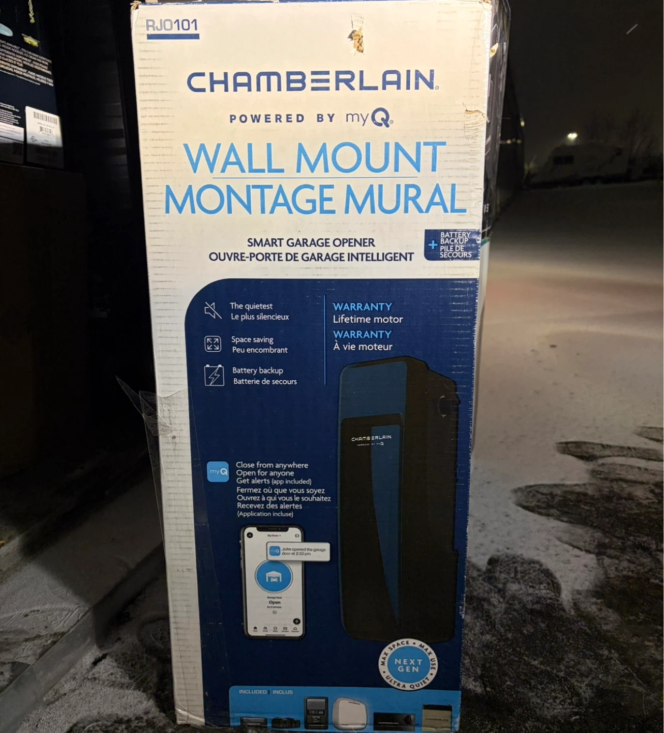 Selling a wall-mount smart garage door opener powered by myQ technology. This unit offers ultra-quiet operation, battery backup, and lifetime motor warranty. It's designed for space-saving versatility and includes smart LED lighting and automatic lock.