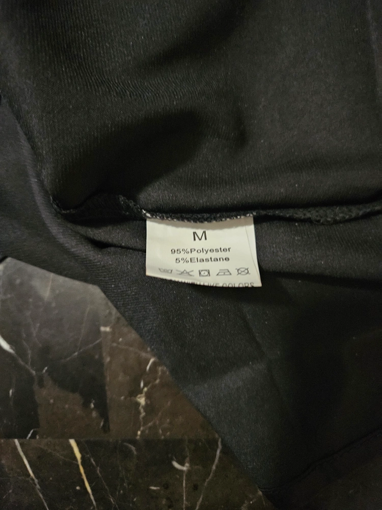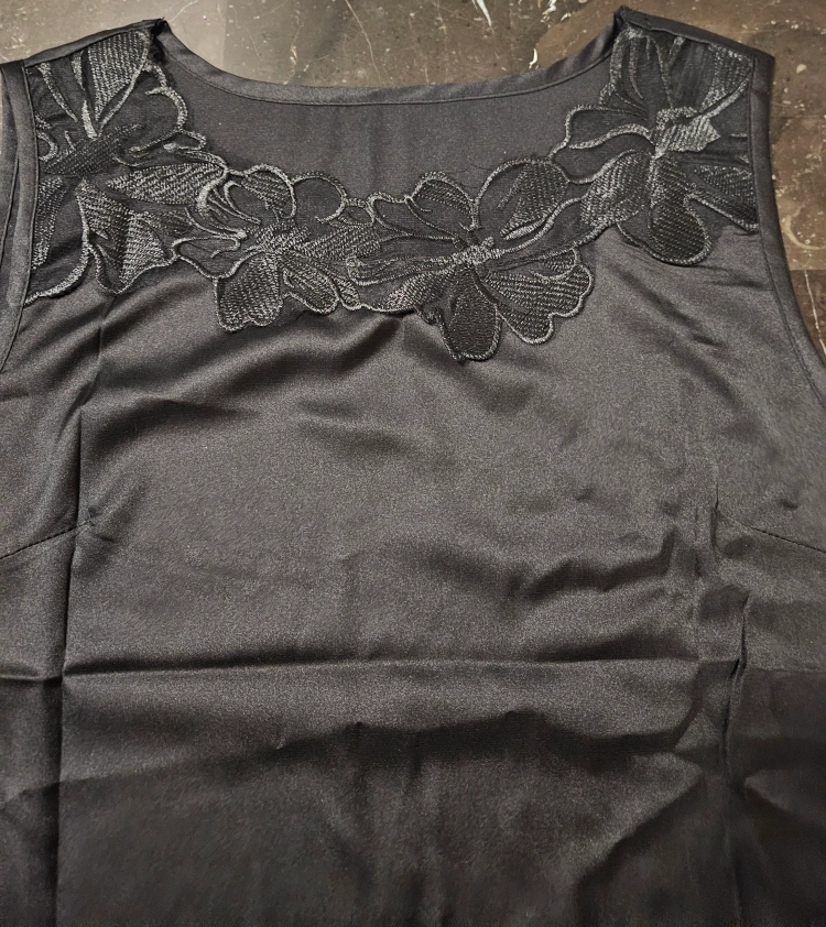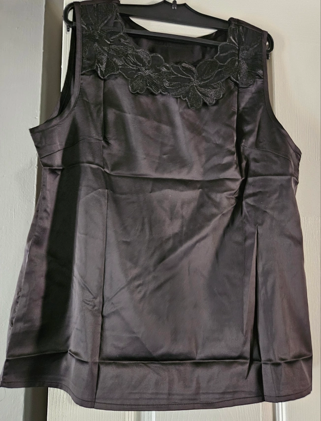 Women's black sleeveless top. Features a beautiful floral lace neckline. 95% polyester, 5% elastane. Size Medium.