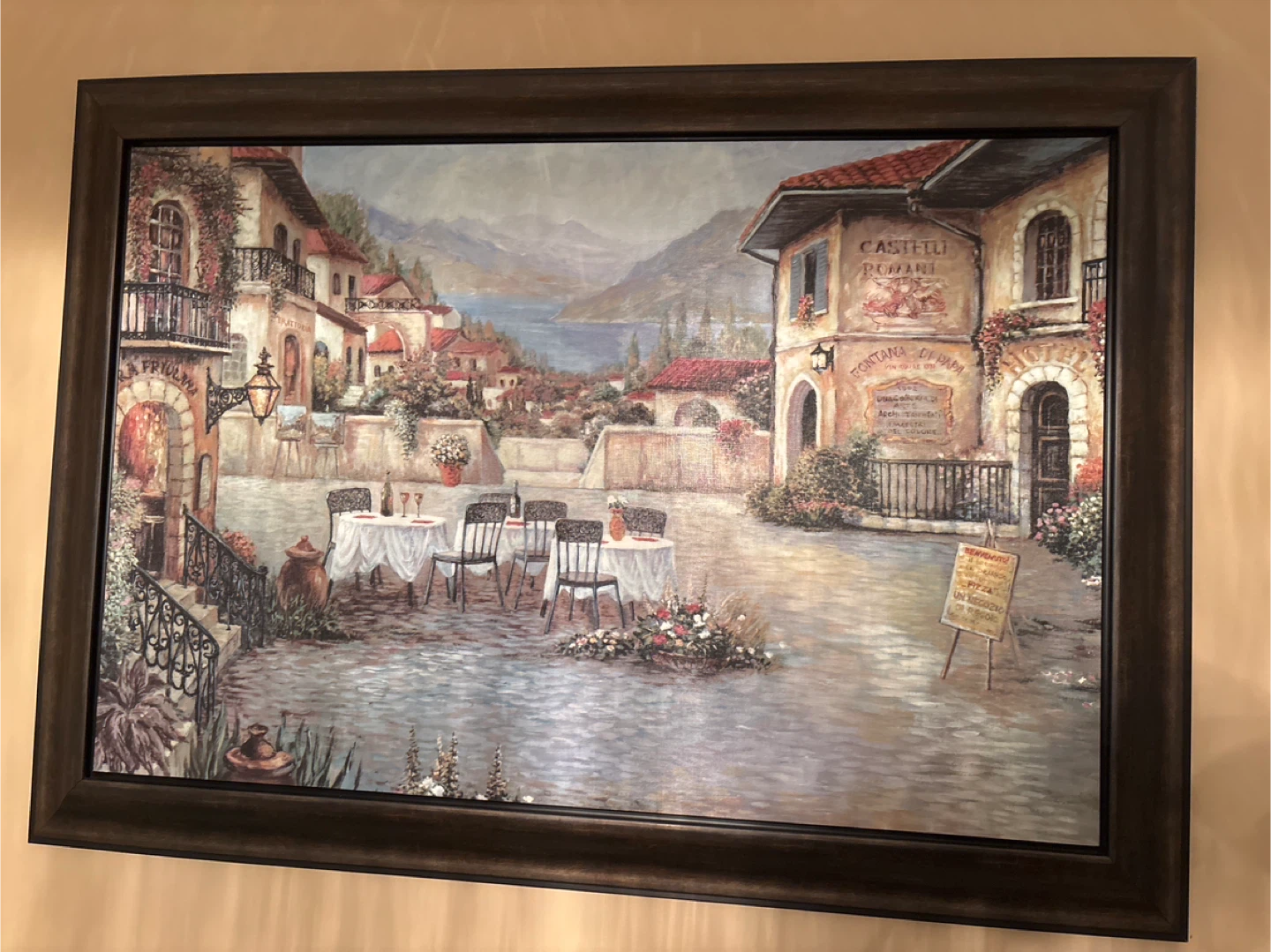 This is a framed painting of a charming Italian village scene. It would look lovely in any room of your home!