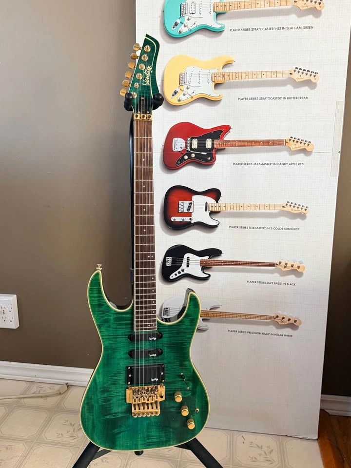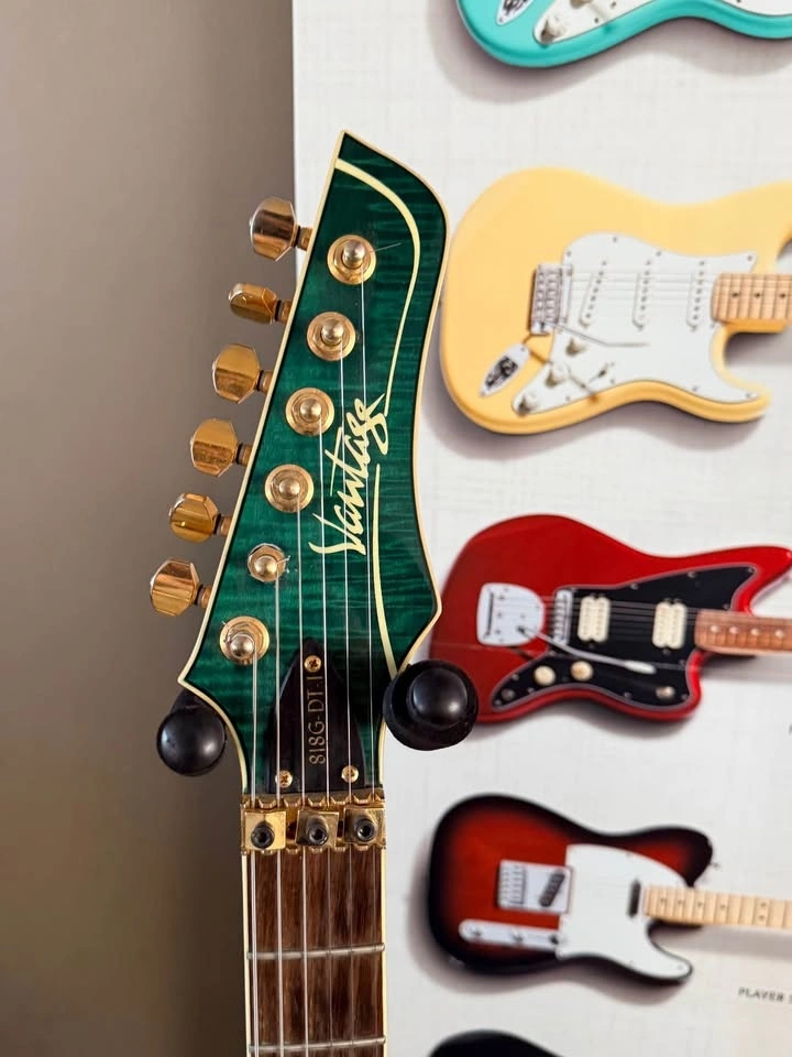 Vantage 818GDT electric guitar from the early 1990s, finished in a stunning Transparent Green flame top. These guitars were handcrafted in Korea during a period when Vantage was producing very solid, well-built instruments with excellent attention to detail.
