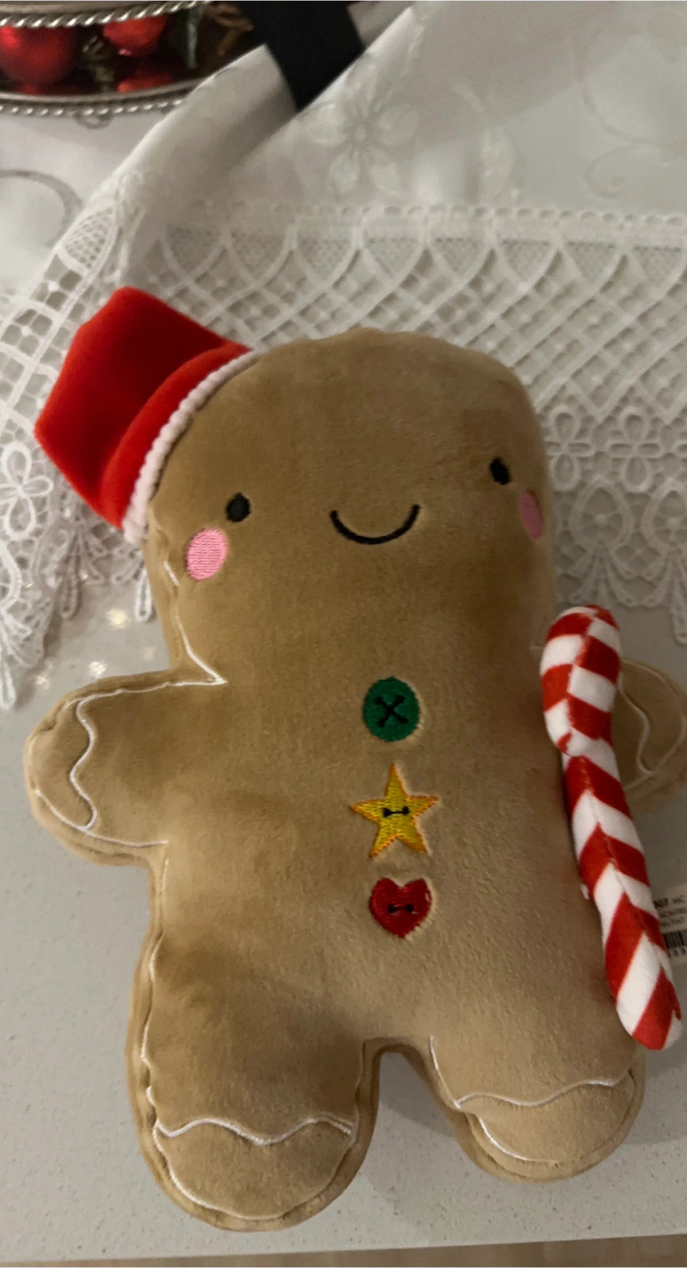 A cute gingerbread man plush toy is up for grabs! It has a red hat and is holding a candy cane. This could be a perfect addition to your holiday decor or a sweet gift for someone special