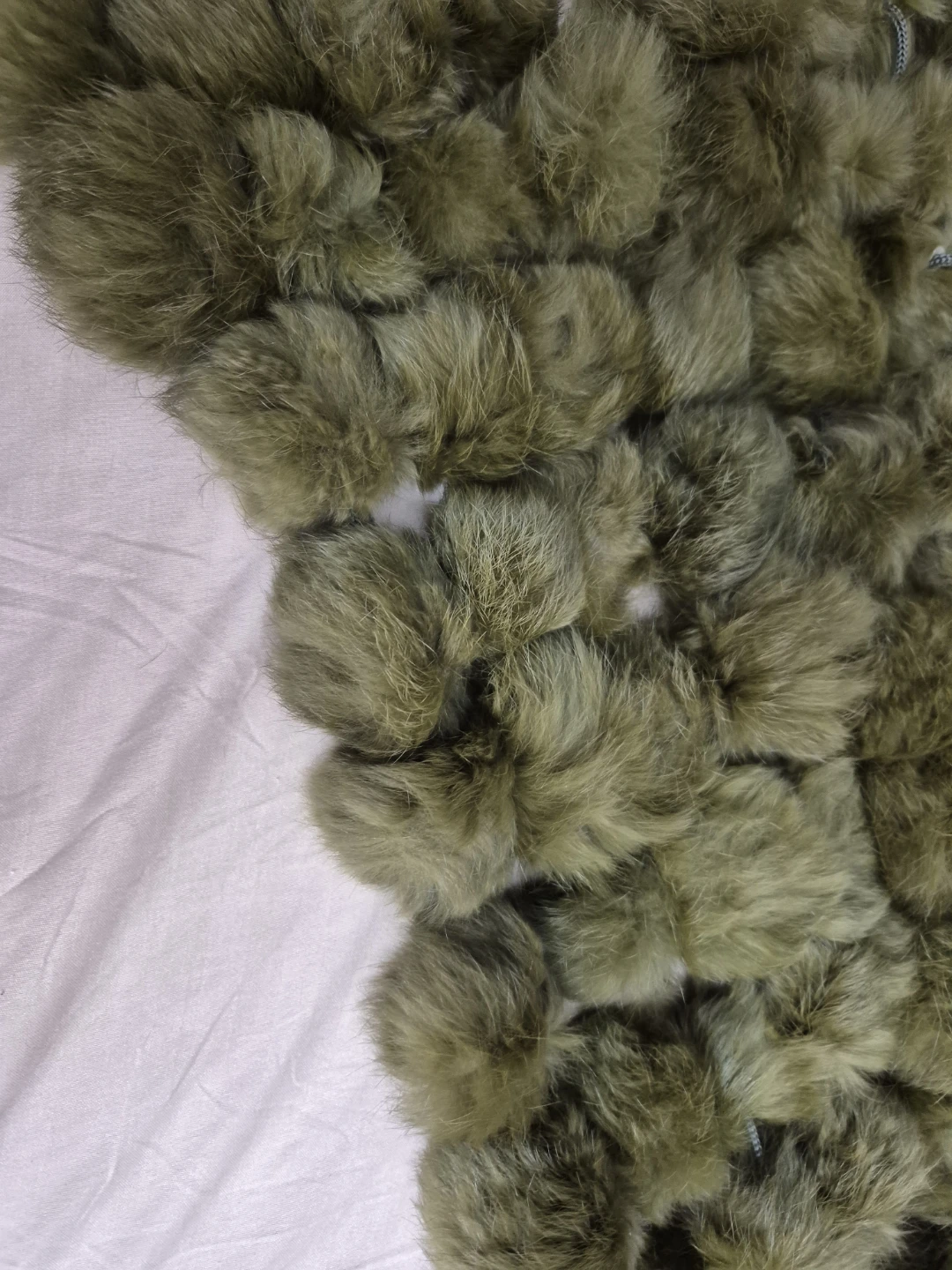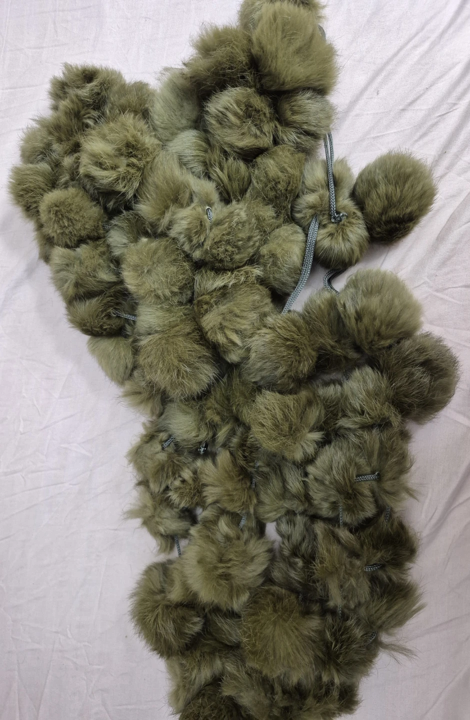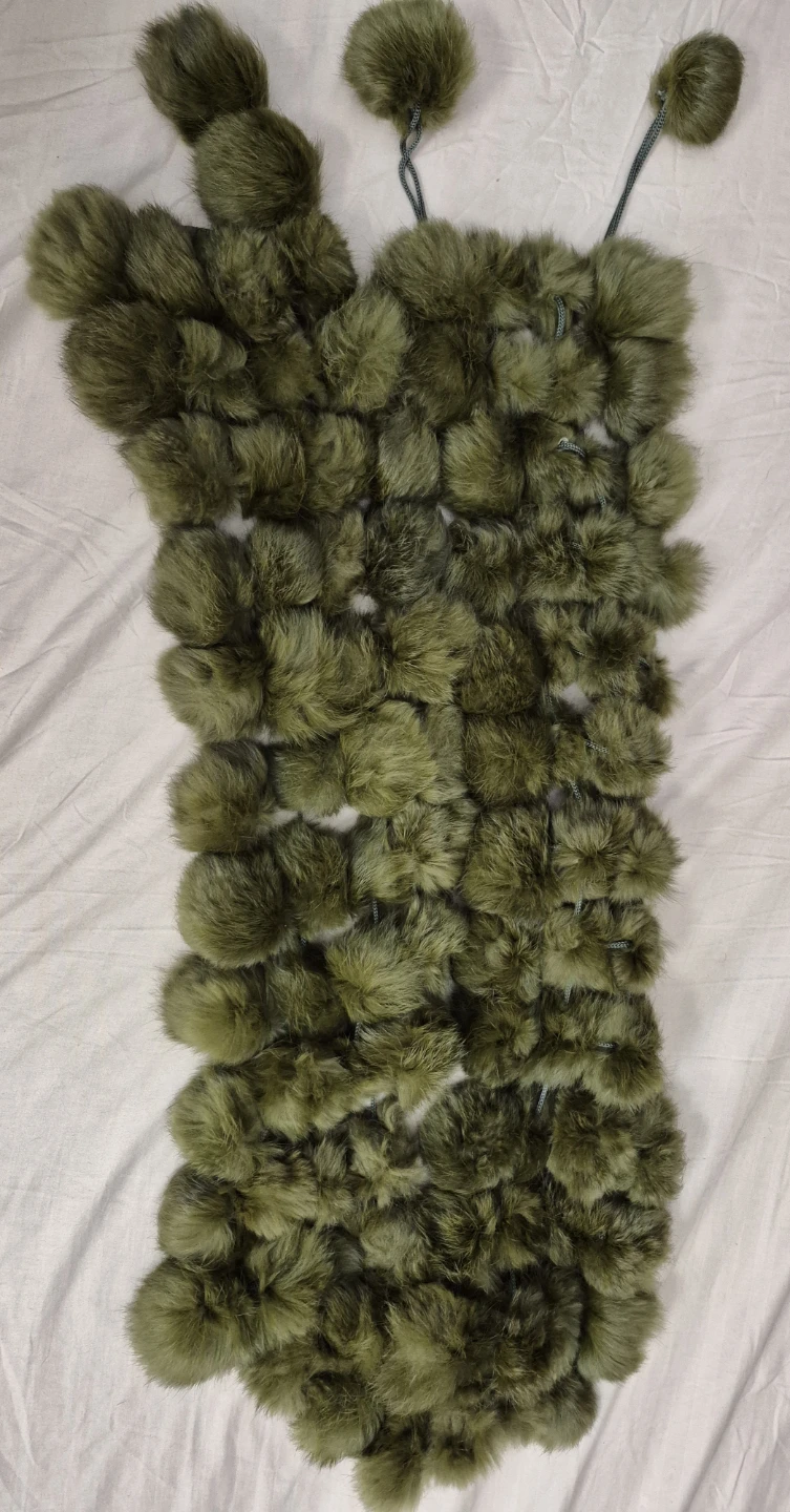 This fluffy scarf is made with many soft pom poms. It's a lovely olive green colour and has tassels on the ends. It's sure to add some flair to your outfit!