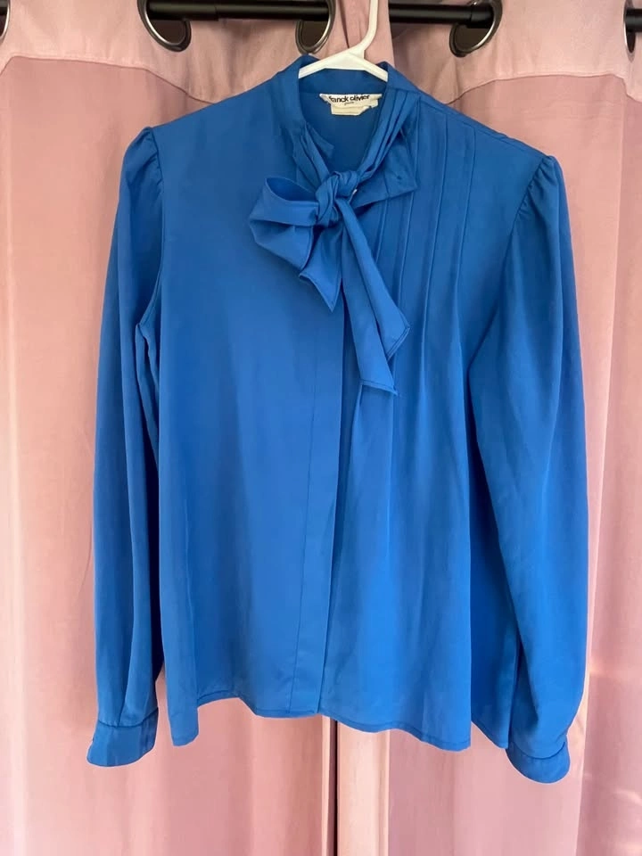 Vintage Franck Olivier Paris blouse, made in France. 100% polyester. Size S-M, chest laid flat measures 19 inches. chic tucked into skirts, pants etc and flowy