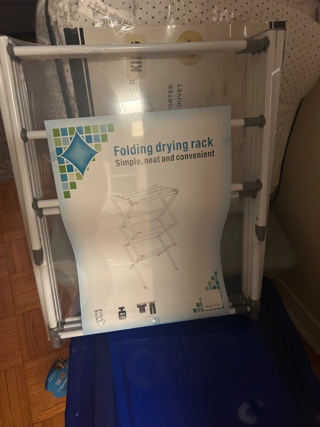 This folding drying rack is simple, neat, and convenient for drying your clothes. It can hold up to 15kg of weight and 15m of clothing. Perfect for small spaces