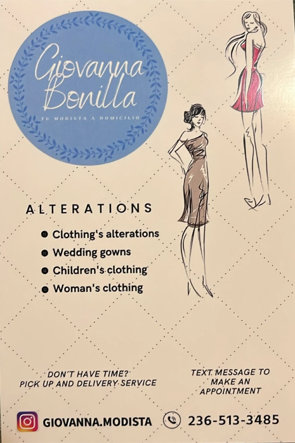 Buy & SellAlterations LatinaAlterations Latina$19Professional in alterations of all kinds of clothing, making uniforms, dresses and pants.ConditionNewWHERE TO MEETCheck LocationView MapSELLERverifiedGiovanna BonillaW End600 reviews1 chats·4 favorites·45 viewsSEND CHAT TO SELLERHi Giovanna Bonilla! I’m interested in your listing.Hi Giovanna Bonilla! I’m interested in your listing.Get the Karrot app to chatSign In to chat