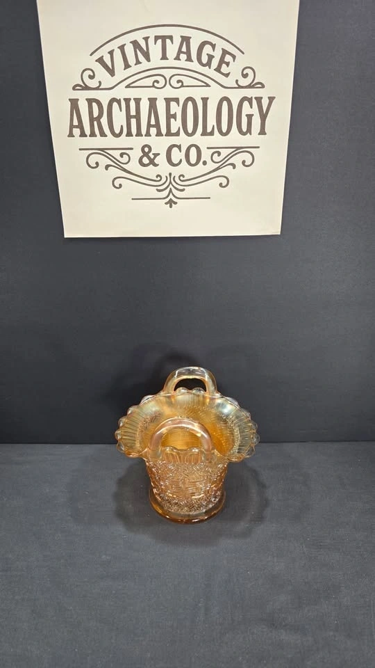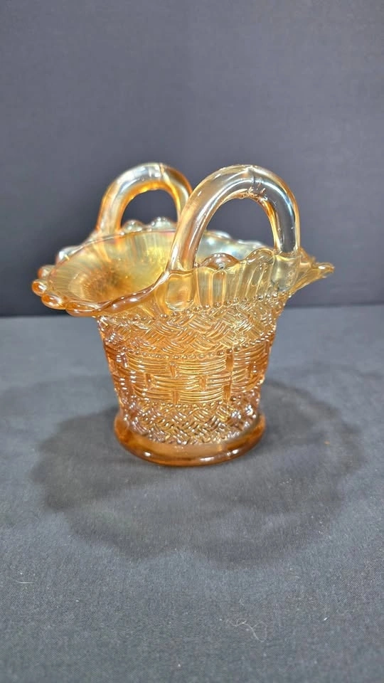 MARIGOLD CARNIVAL GLASS BASKET WITH BASKETWEAVE PATTERN