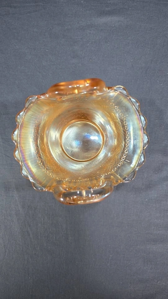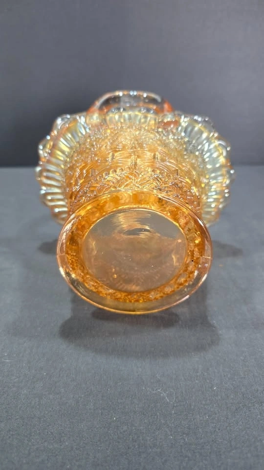 The iridescent marigold finish was achieved by spraying metallic salts on the glass while still hot, creating the distinctive shimmering effect that collectors prize today.