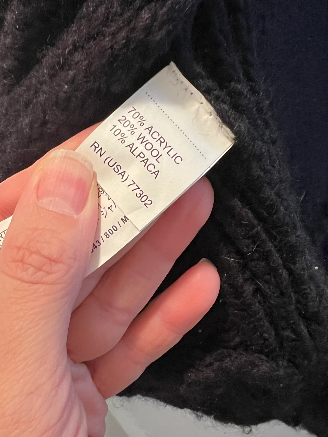 Cozy black maternity sweater from ZARA KNIT featuring a detailed cable knit design throughout. It's made with a blend of 70% acrylic, 20% wool, and 10% alpaca for warmth and texture. This sweater has long sleeves and a flattering scoop neckline, perfect for layering during cooler weather.