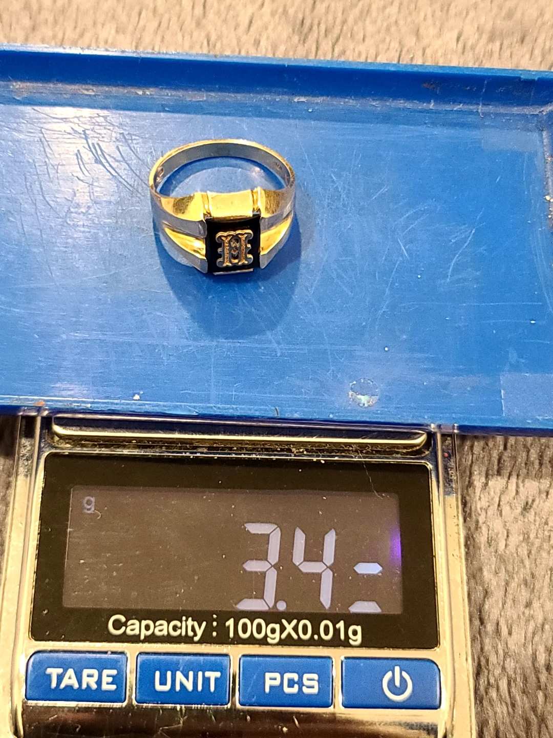 This is a 10K gold signet ring with a black inlay and an "H" initial. It weighs 3.4 grams. A classic piece for everyday wear.