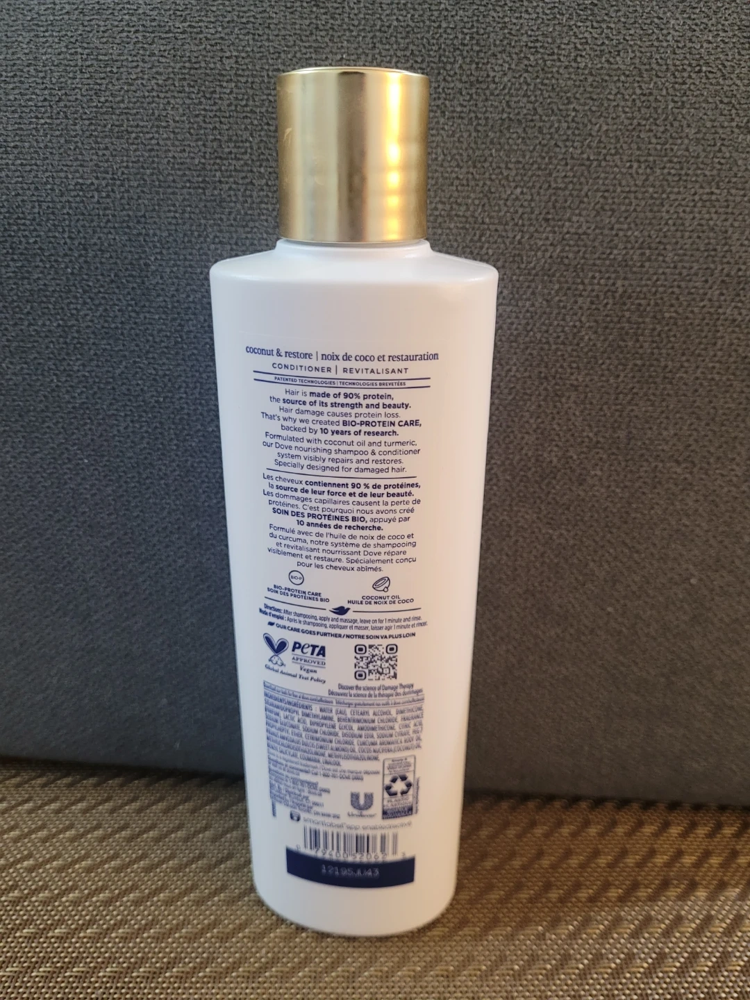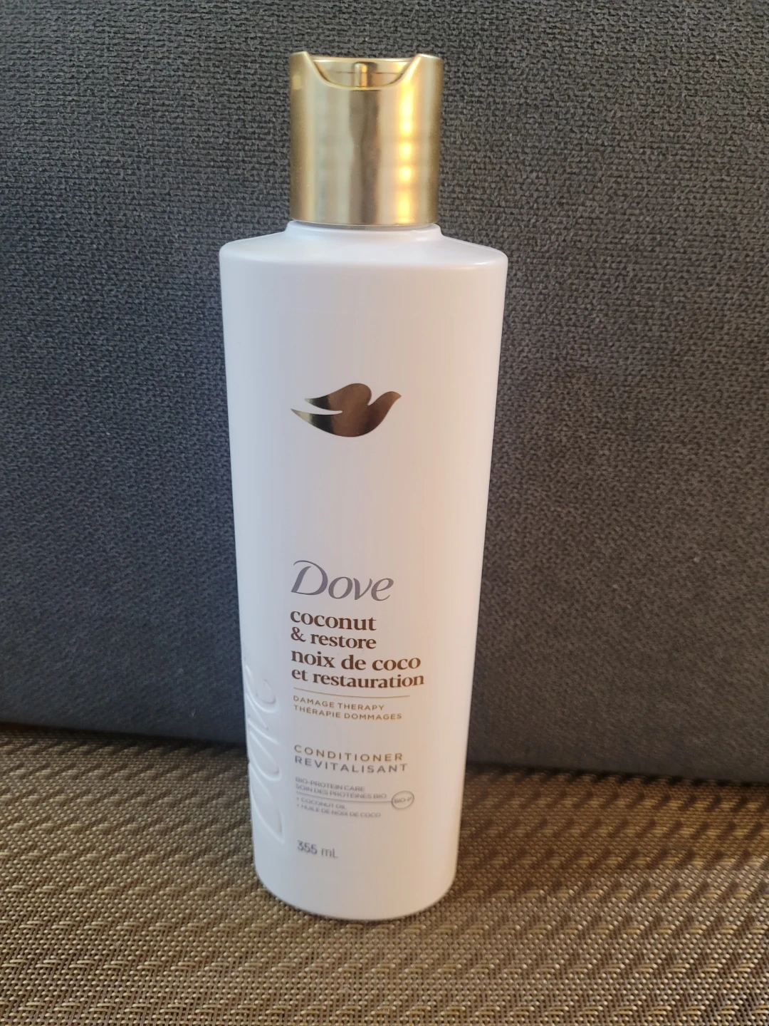 Dove Coconut & Restore conditioner for damaged hair. It's formulated with coconut oil and turmeric. It helps strengthen and restore hair, making it feel healthier.