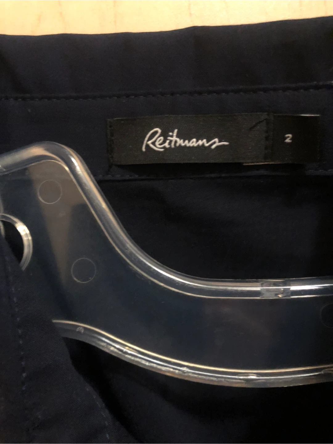 This is a Reitmans navy blue short-sleeved shirt dress. It features a button-up front and has two pockets buttons style. The dress is a size 2.