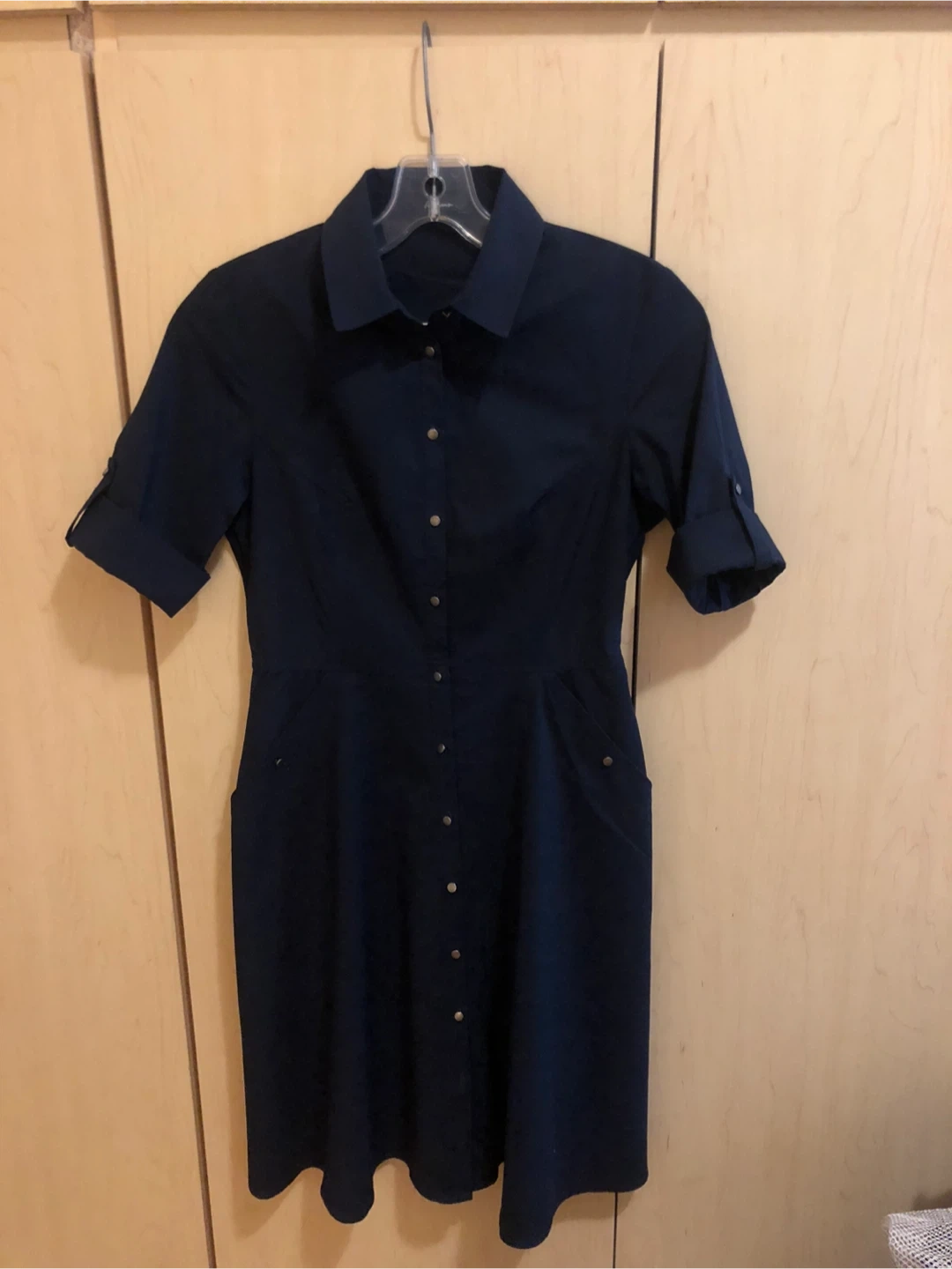 This is a Reitmans navy blue short-sleeved shirt dress. It features a button-up front and has two pockets buttons style. The dress is a size 2.