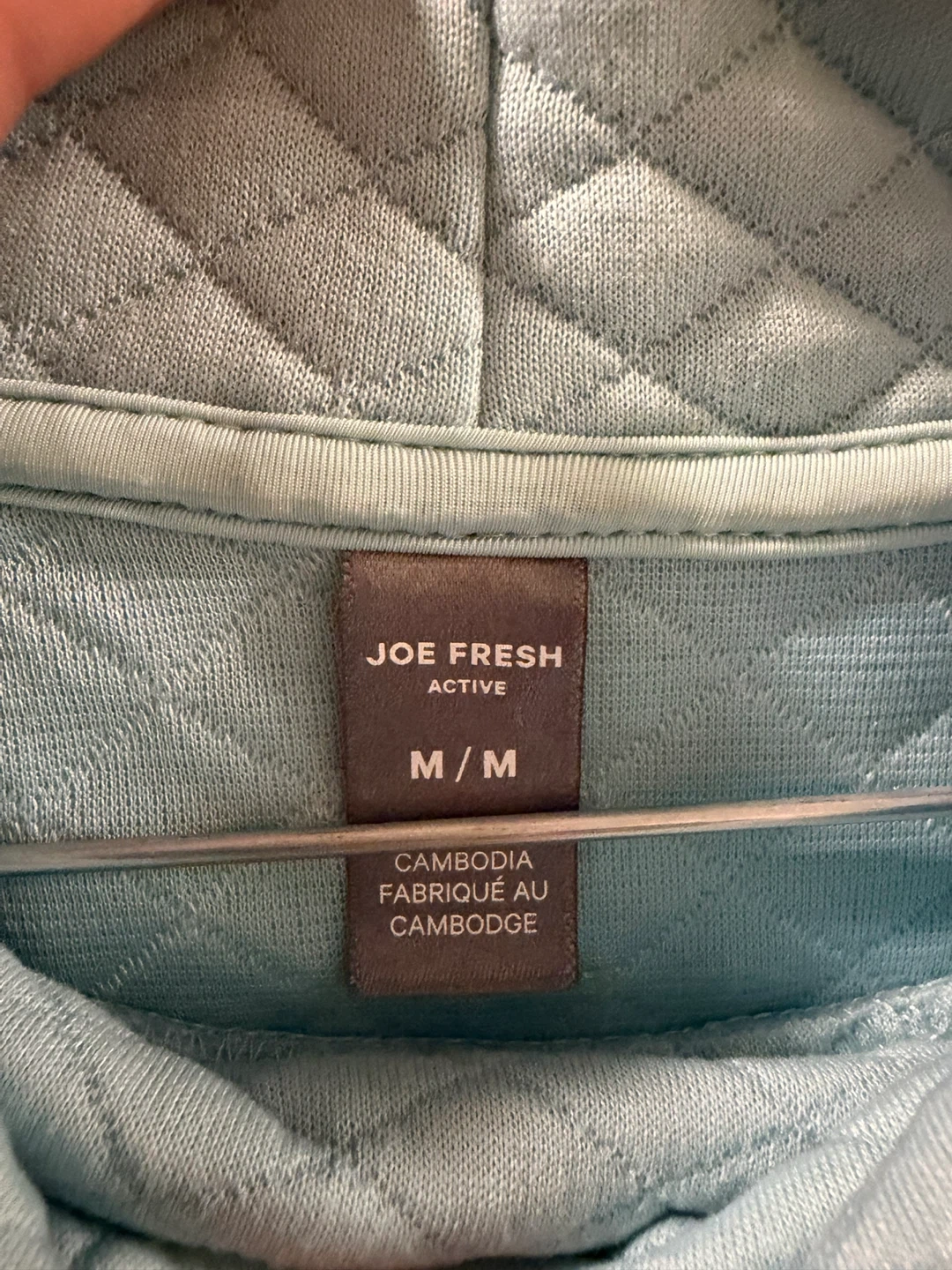 This Joe Fresh Active sweatshirt features a diamond quilting pattern and a comfortable cowl neck. It's a size medium and made in Cambodia. It's a great casual top for cooler weather!