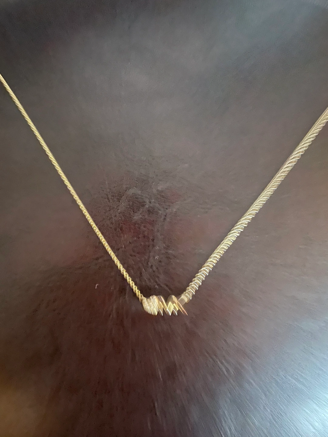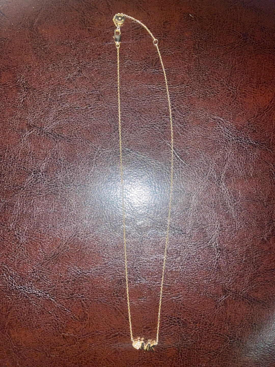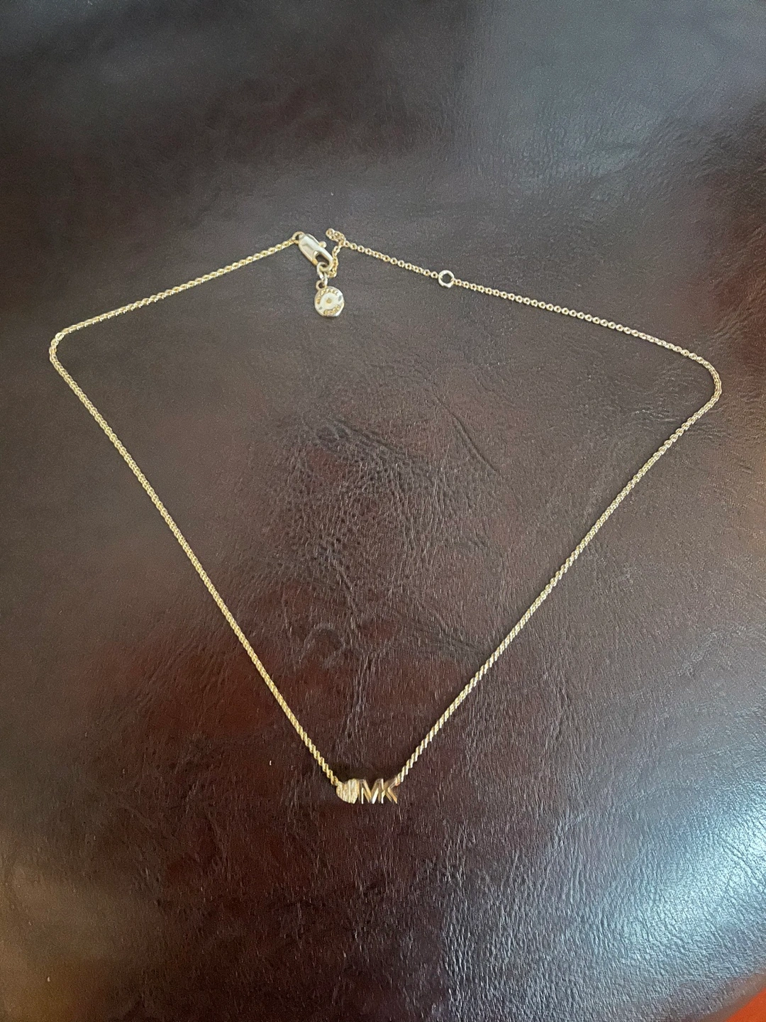 A beautiful delicate necklace. A gold-coloured chain with a heart-shaped pendant featuring the letters MK. A lovely piece of jewelry to wear on a date night.