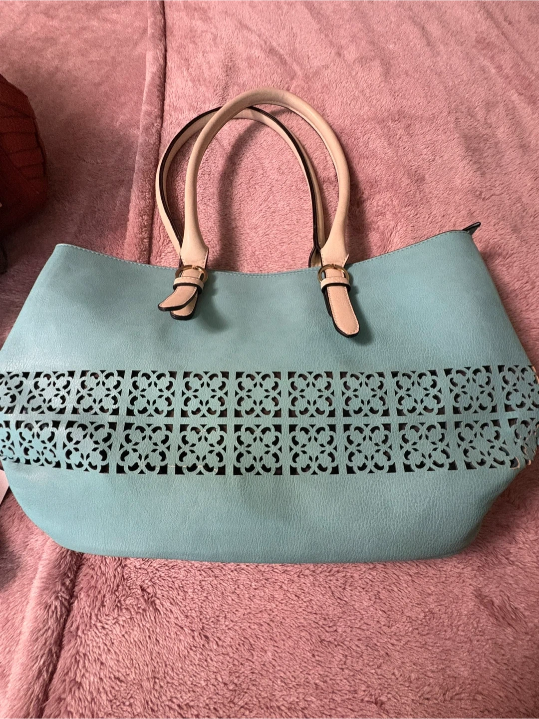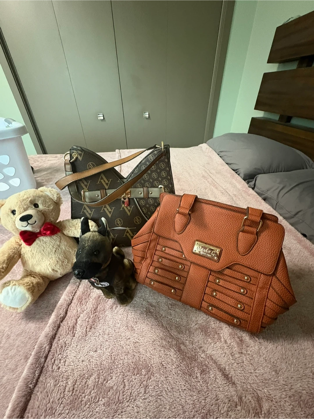 Four stylish women's handbags in various colours and designs. Includes one orange pebbled faux leather handbag with gold stud accents, one brown monogrammed hobo bag, a light blue tote with cut-out detailing, and a mustard yellow shoulder bag. Great for everyday use or special occasions!