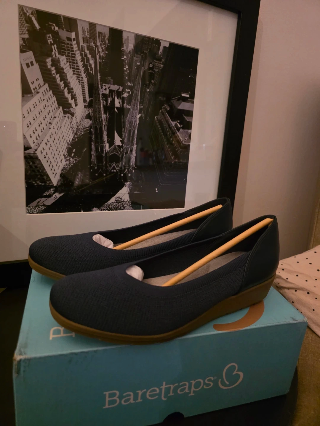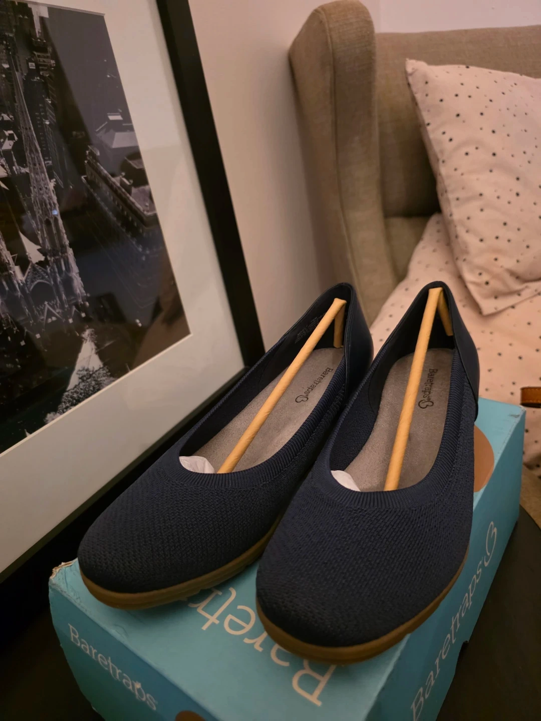 Baretraps Marily flats in navy. Women's size 7 1/2, medium width. These comfortable flats feature a knit upper with a faux leather heel accent. Includes original box.