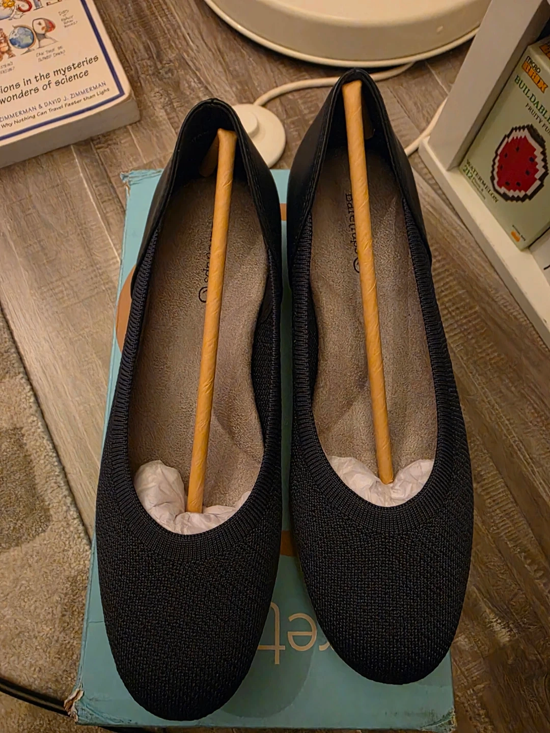 Baretraps Marily flats in navy. Women's size 7 1/2, medium width. These comfortable flats feature a knit upper with a faux leather heel accent. Includes original box.