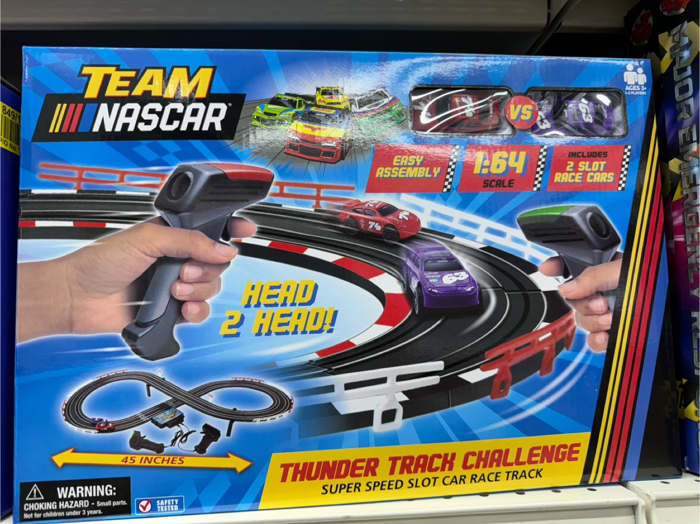 Get ready for some head-to-head racing action with the Team NASCAR Thunder Track Challenge! This super speed slot car race track is perfect for ages 3+. It's easy to assemble and includes 2 slot race cars. The track is 45 inches long and built to 1:64 scale.