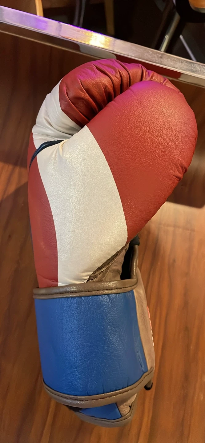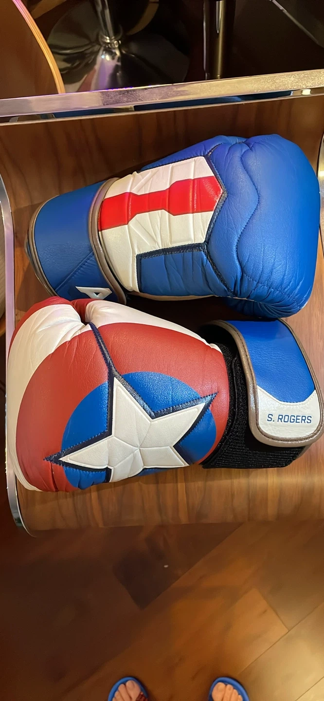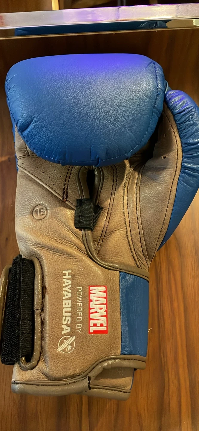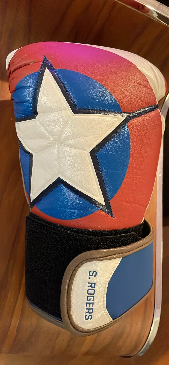 These Hayabusa boxing gloves are designed with Captain America's iconic look. They are branded "S. ROGERS" and feature the Marvel logo. Size 16oz.