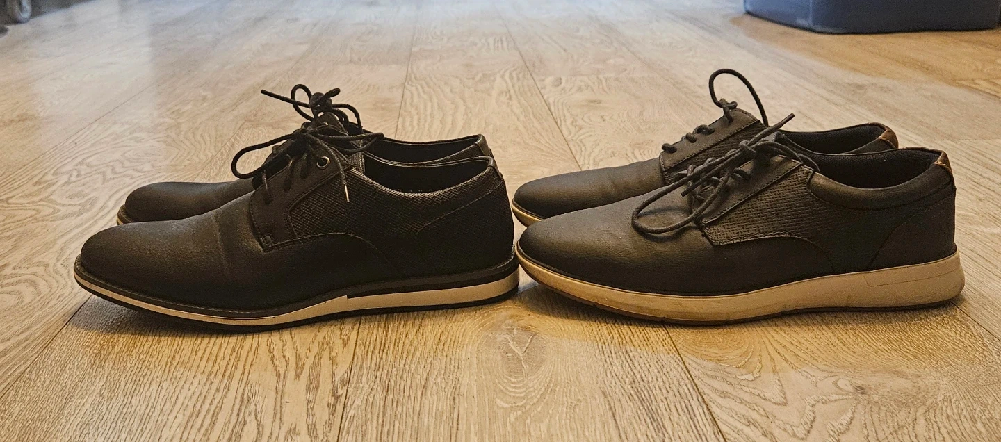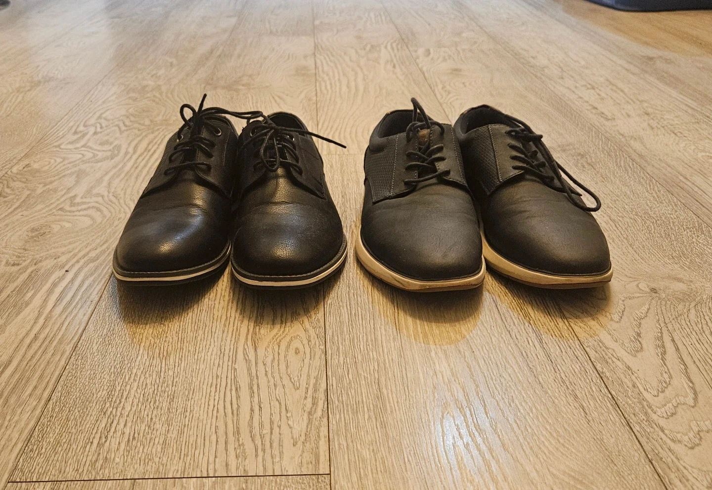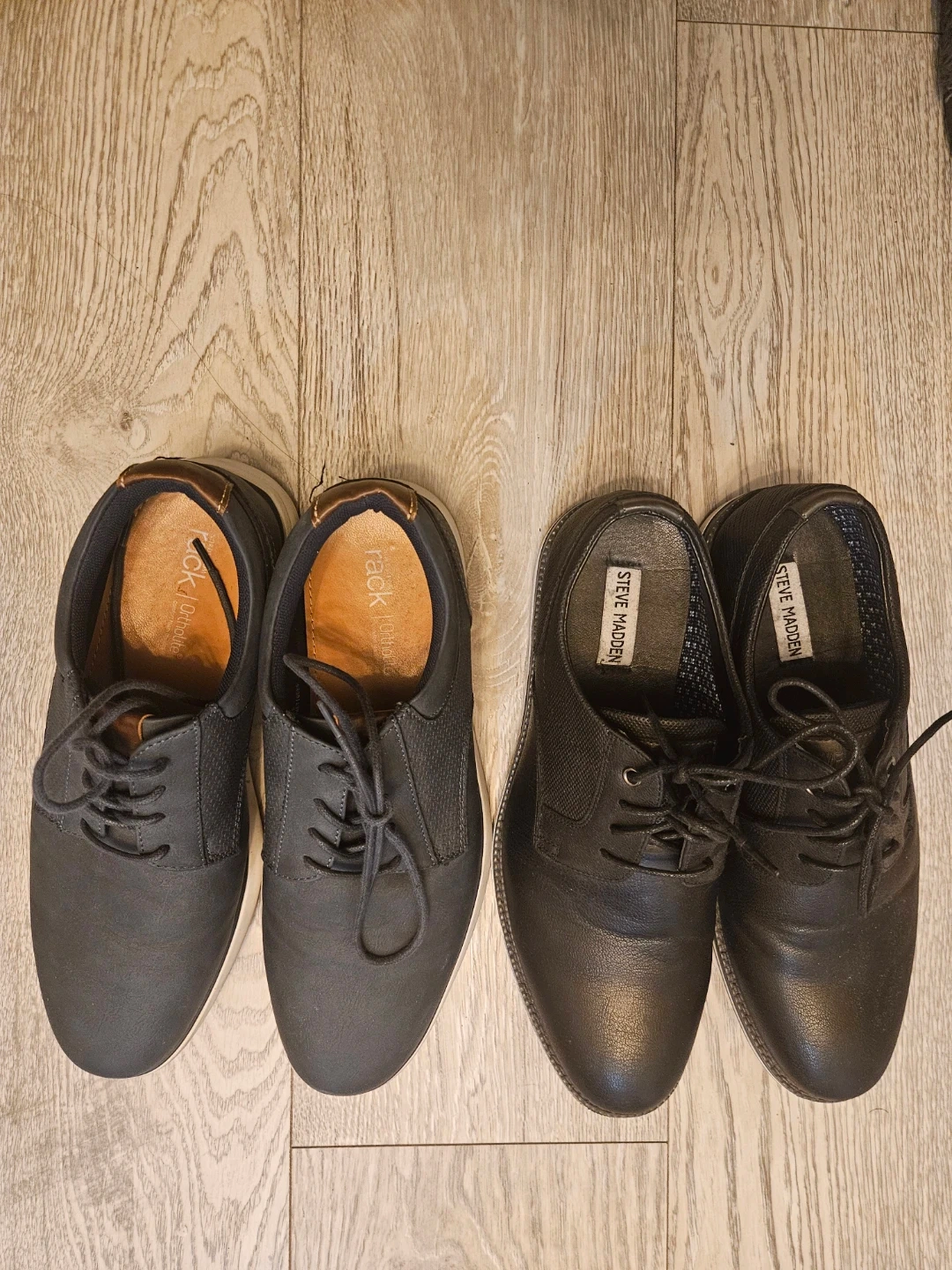 Two pairs of men's dress shoes. One pair is Steve Madden black lace-up shoes. The other pair is black lace-up shoes from Rack Room Shoes. Both pairs are in good condition.
