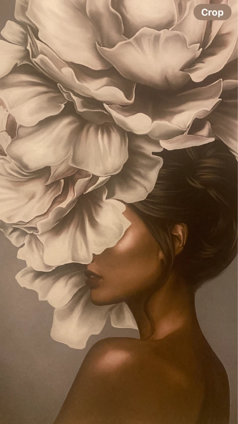 This art print depicts a woman with a large, white flower cascading over her head. It features a profile view of the woman against a muted grey background. The print's colours are soft and artistic, creating a striking visual.