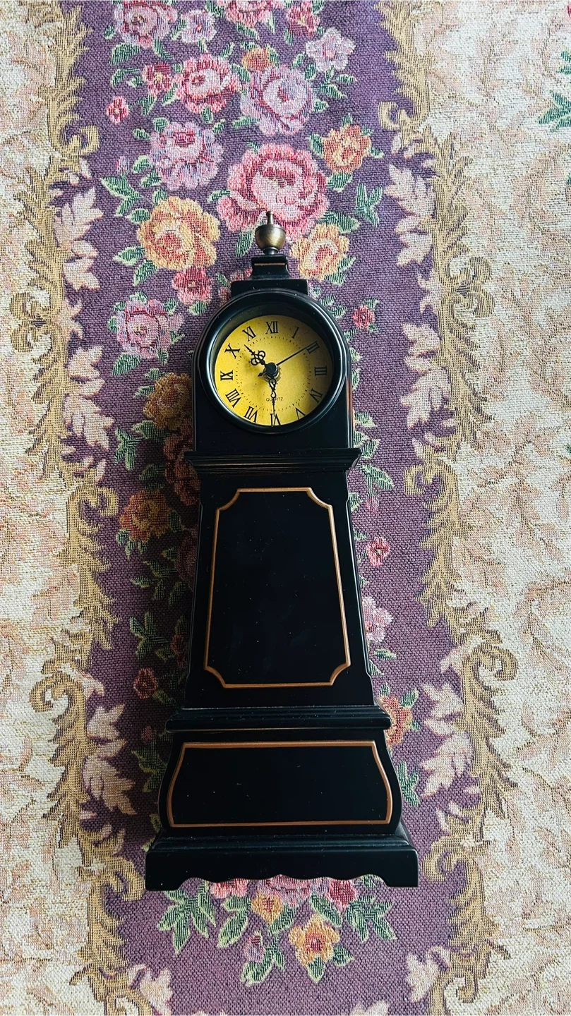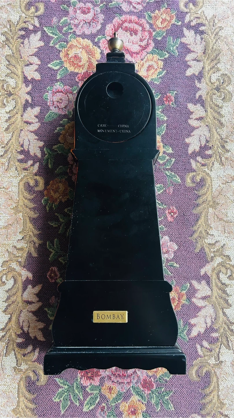 This black Westminster chime clock from Bombay features a yellow clock face with Roman numerals. It's made in China. This clock would look great on a mantelpiece or side table.
