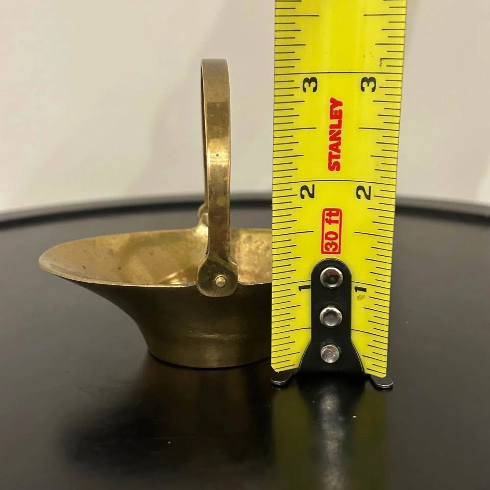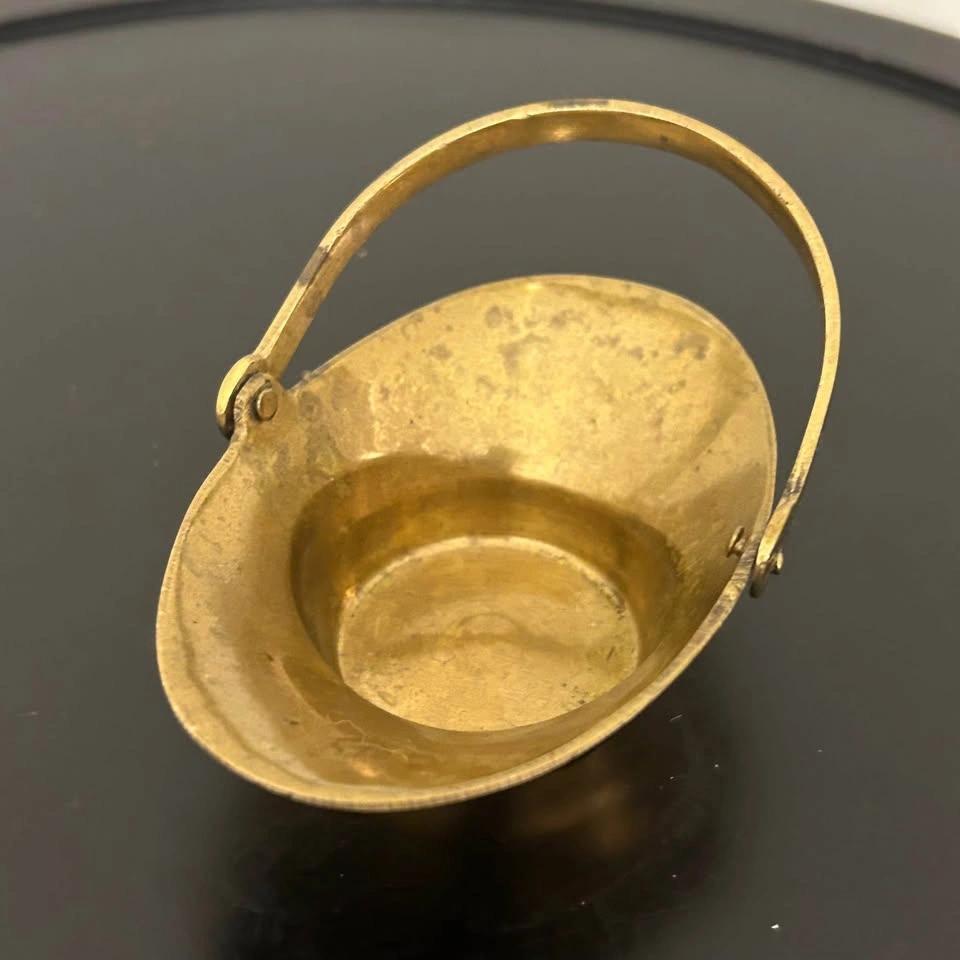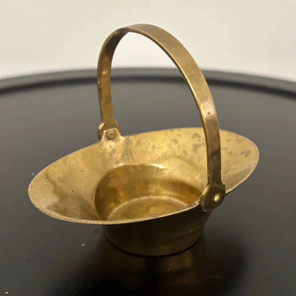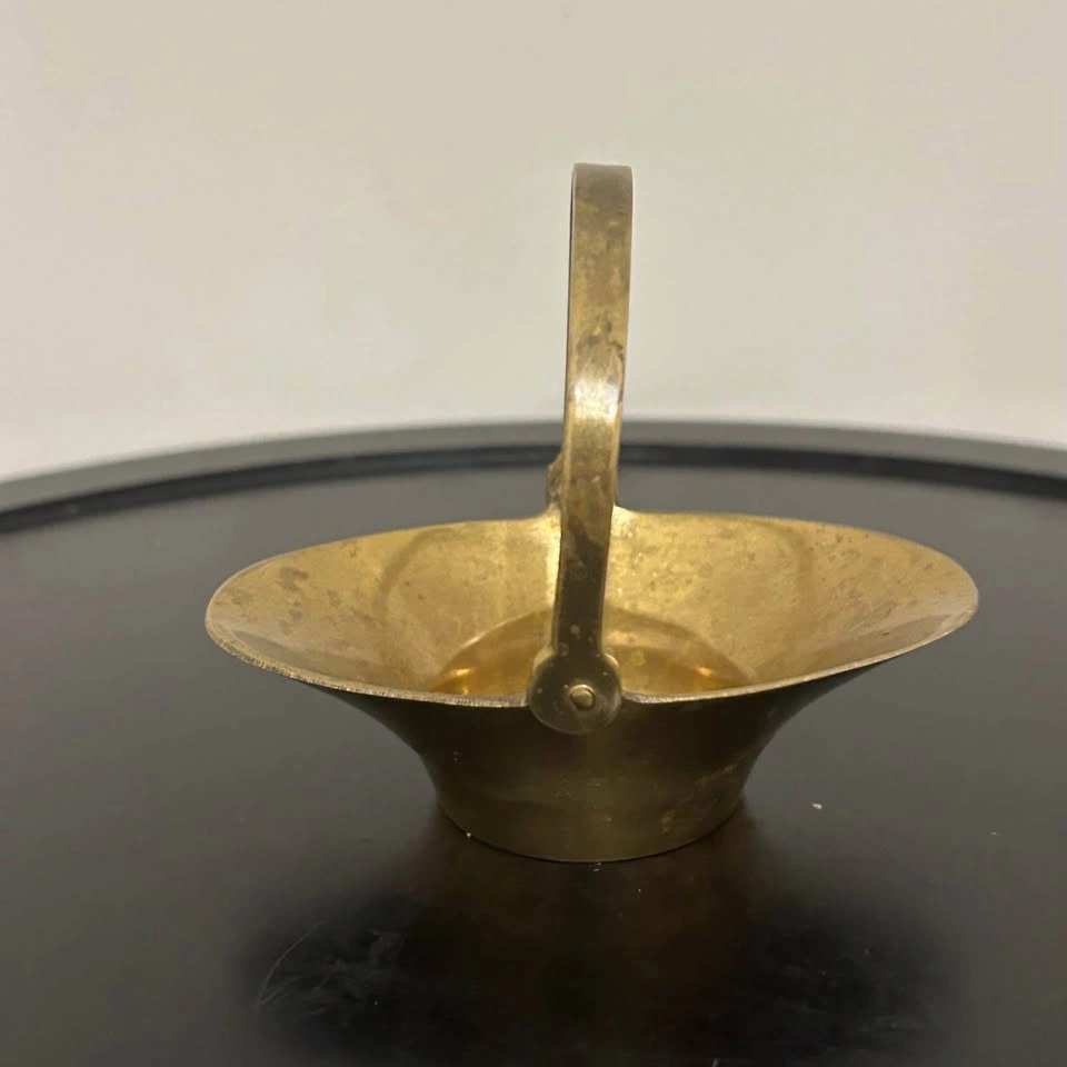 Charming vintage mini brass basket featuring a flared base and smooth curved handle. This timeless little piece makes a beautiful accent for a shelf, desk, or display case — perfect for holding rings, trinkets, or small flowers. The aged brass patina adds a lovely warm tone and vintage character.