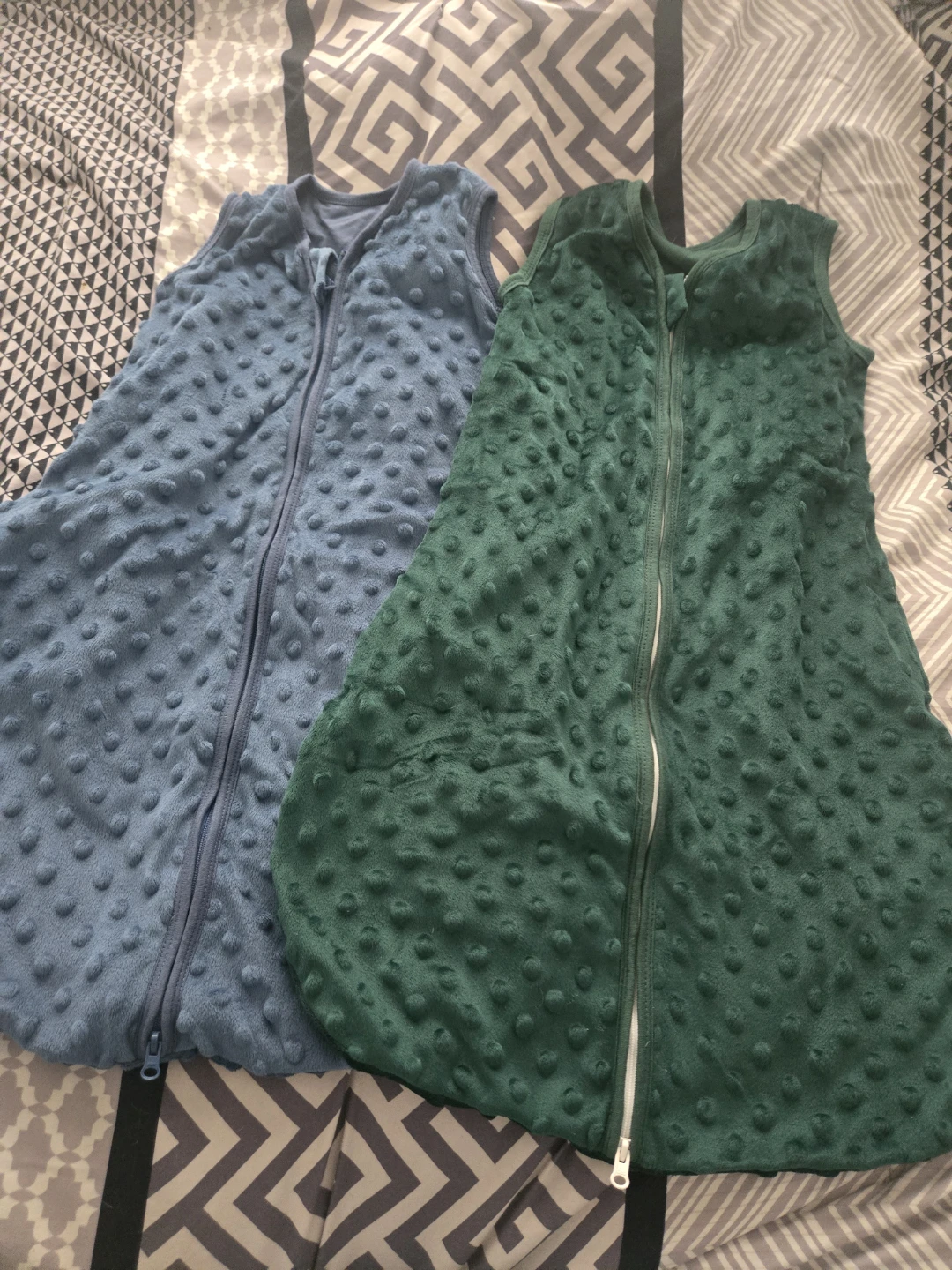 Bundle of two sleeveless baby sleep sacks. One is blue and the other is green. Both have a textured dot pattern and a front zipper closure. These are cozy and practical for nap times and bedtime!