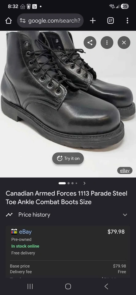Unused Canadian Armed Forces steel-toed parade ankle boots, approximately size 11. Pick up in St. Albert. I am switching around my collectibles, so please check my other listings.