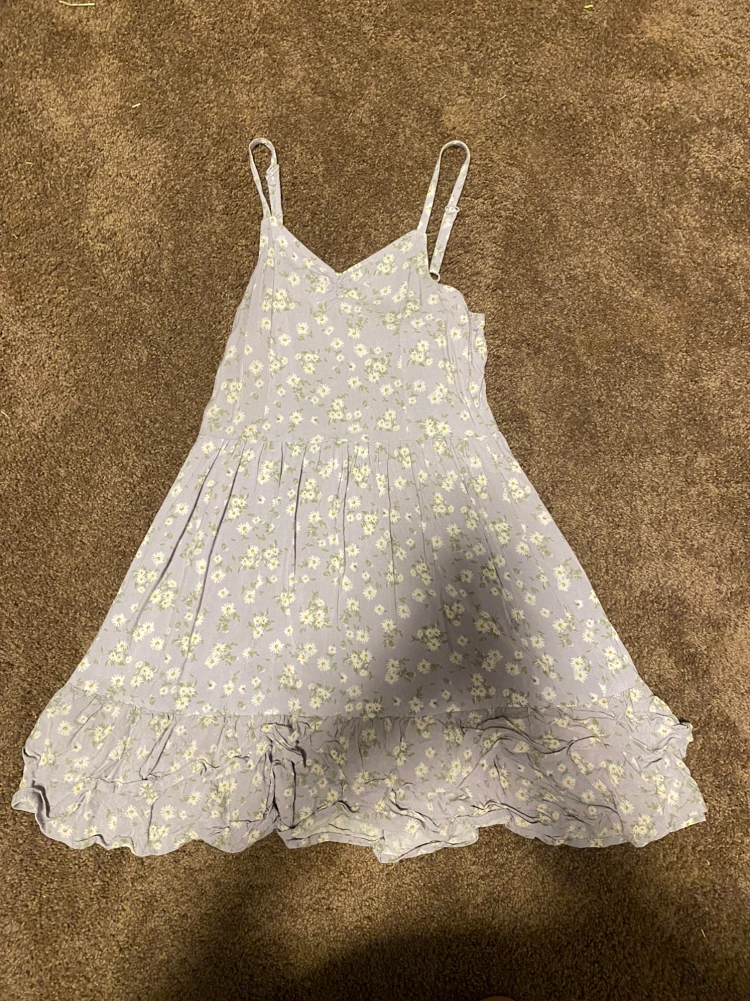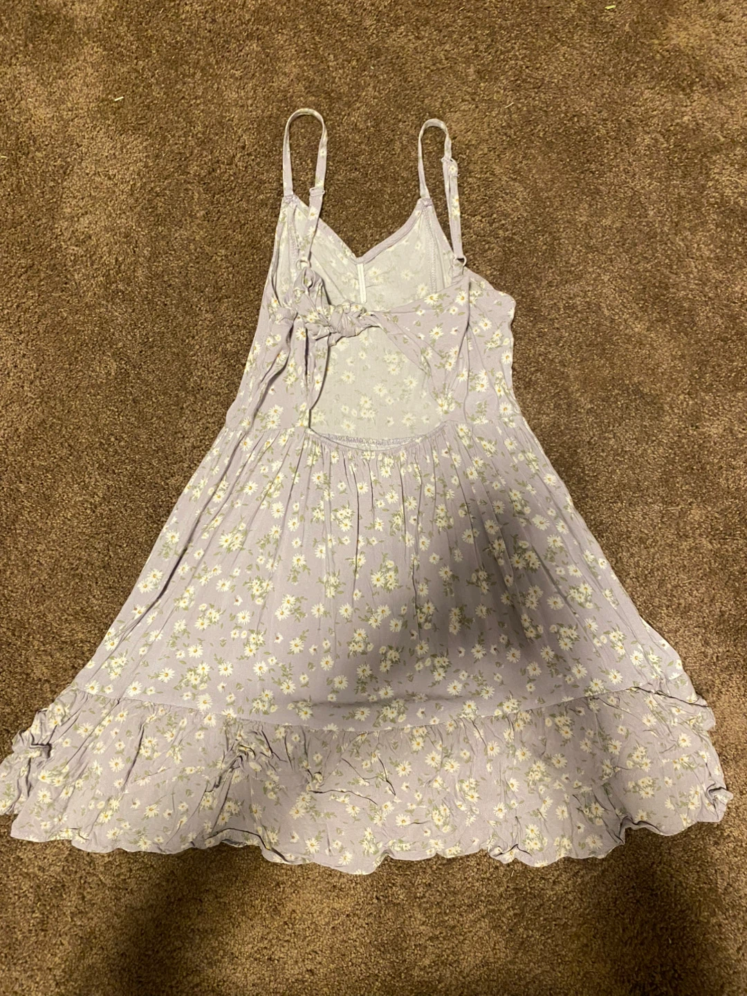 This light purple mini dress features a delicate white floral print and a ruffled hem. It has adjustable spaghetti straps and a tie detail at the back. Lightweight fabric. Size 10/12