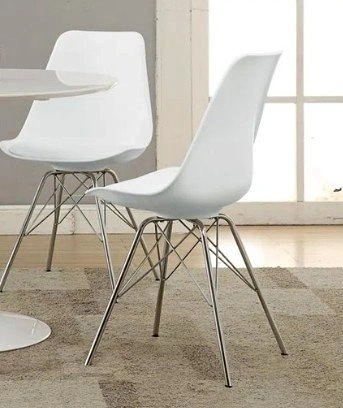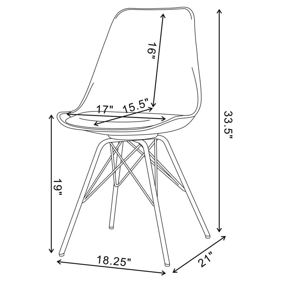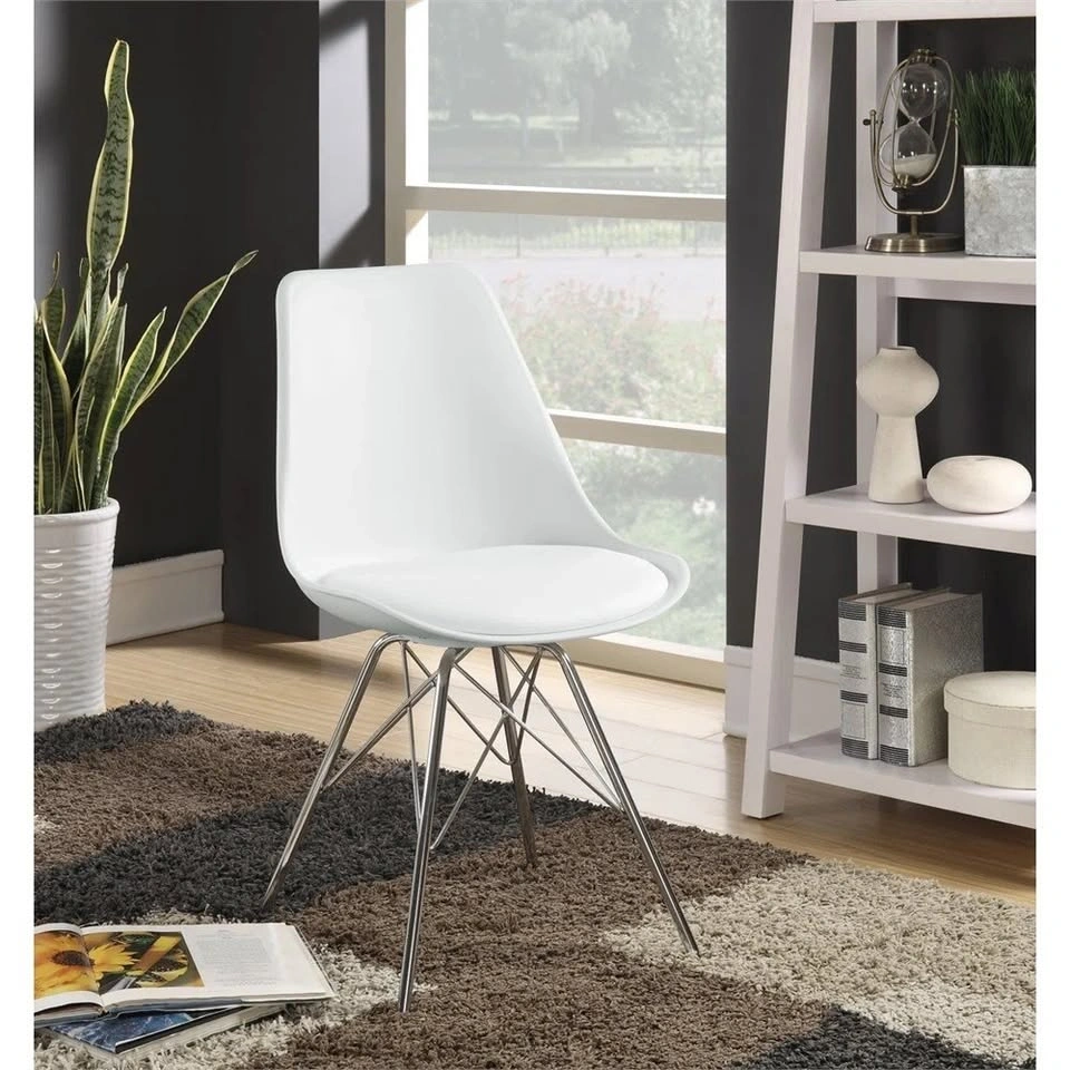 Set of 2 Wrought Studio® Slade Faux Leather Dining Chairs. Dining side chair with smooth leatherette upholstered cushion. Chrome electroplated metal Eiffel-style legs add modern angular design and stability. Lightly cushioned seat provides comfort without compromising style. Bold, contemporary look complements minimalist and modern decor. Durable polypropylene construction is easy to clean and suitable for everyday use. Perfect for enhancing dining rooms, kitchens, or home offices with a modern touch. Let me know if you're interested!