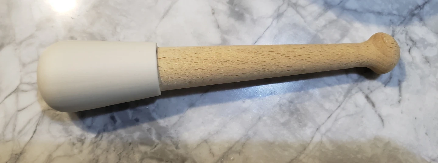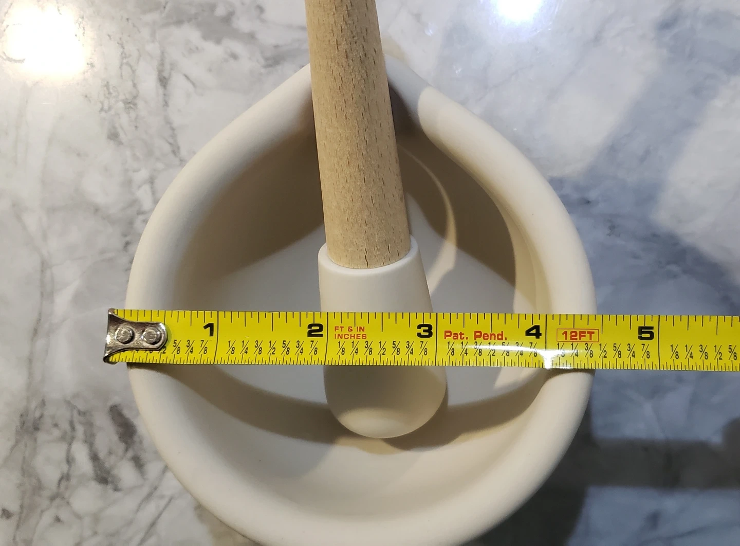 This is a Milton Roy ceramic mortar and pestle set. The mortar is 3.75 inches in diameter and 2.5 inches high. The pestle is 6 inches long and made of wood with a matching ceramic end. Colour is cream.