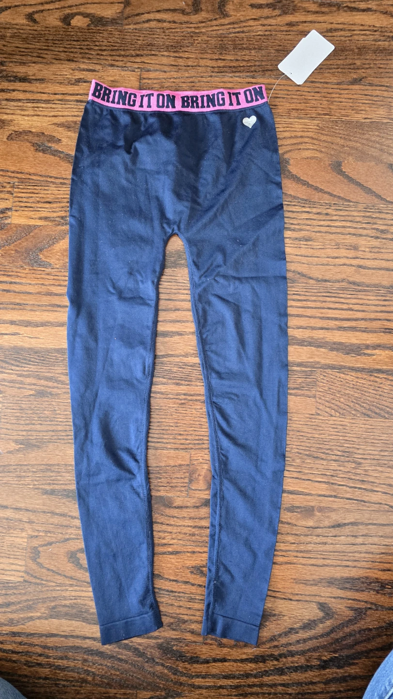 Blue seamless leggings with a pink "Bring It On" waistband. Made from a blend of polyamide and elastane. Size 134/140.