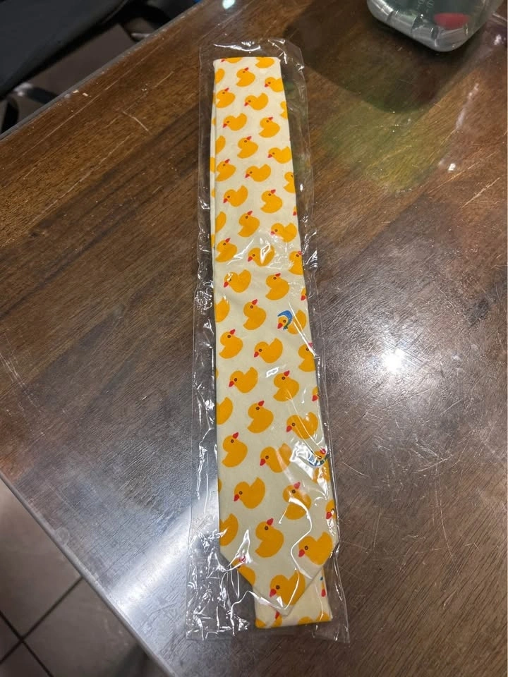 Fun and quirky necktie. Yellow rubber duckies on a cream background. New with tags. Perfect for adding a touch of whimsy to your outfit.