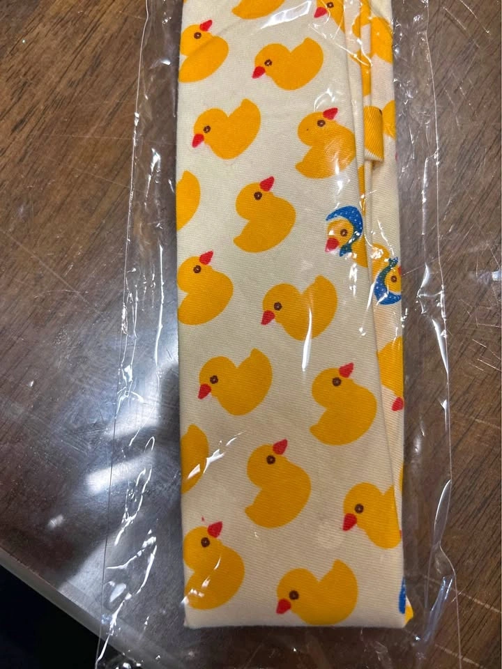 Fun and quirky necktie. Yellow rubber duckies on a cream background. New with tags. Perfect for adding a touch of whimsy to your outfit.