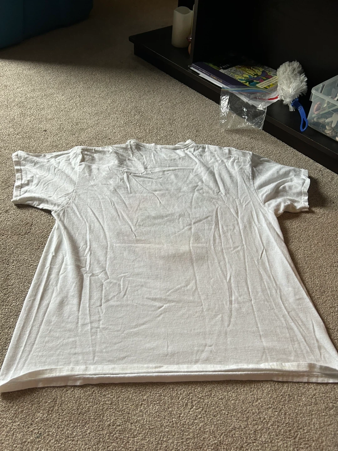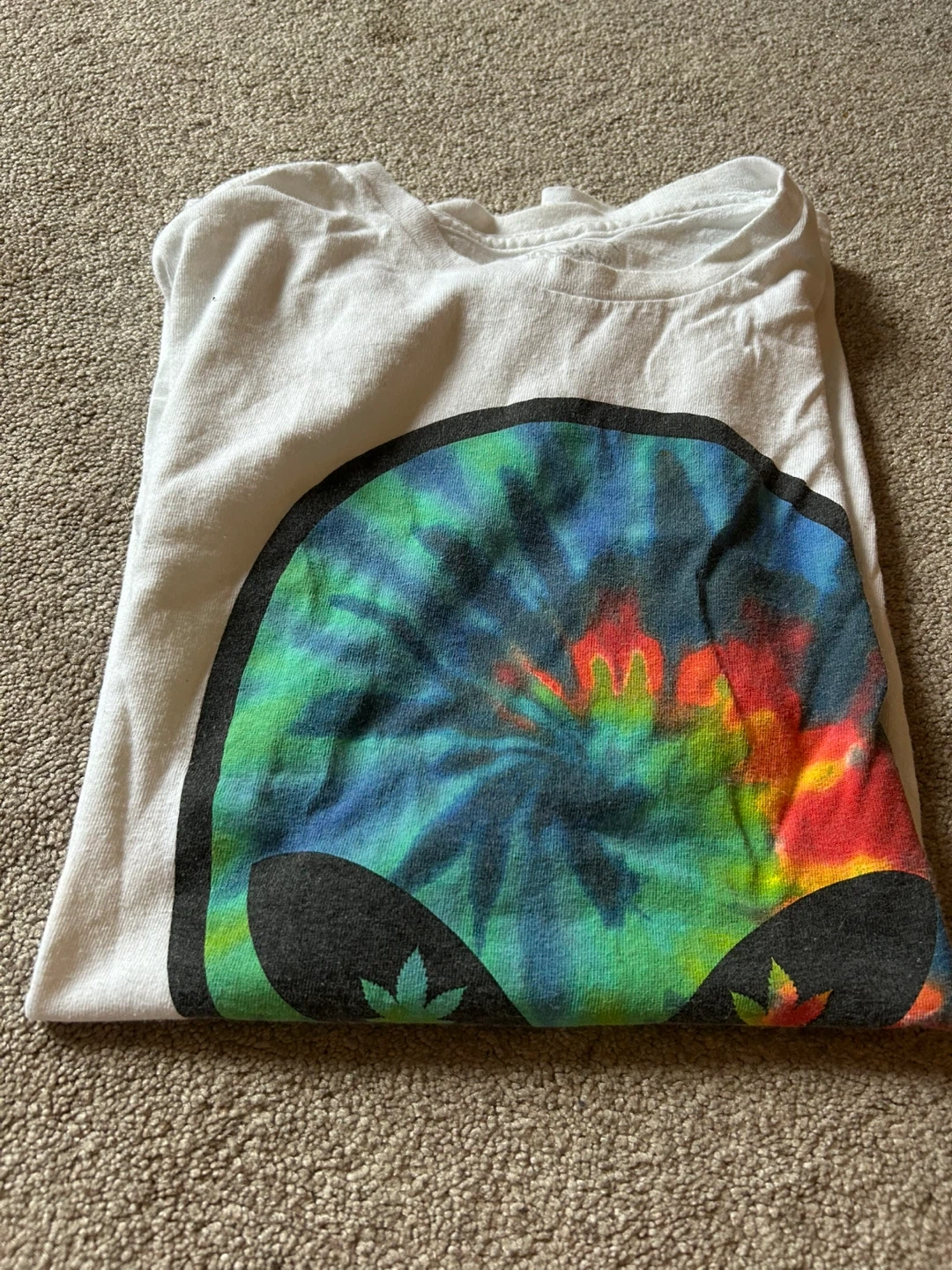 White Spencer’s graphic t-shirt featuring a tie-dye alien design with leaves in its eyes. Unique psychedelic style tee that’s perfect for streetwear, festival outfits, or anyone who likes trippy / space themed clothing.