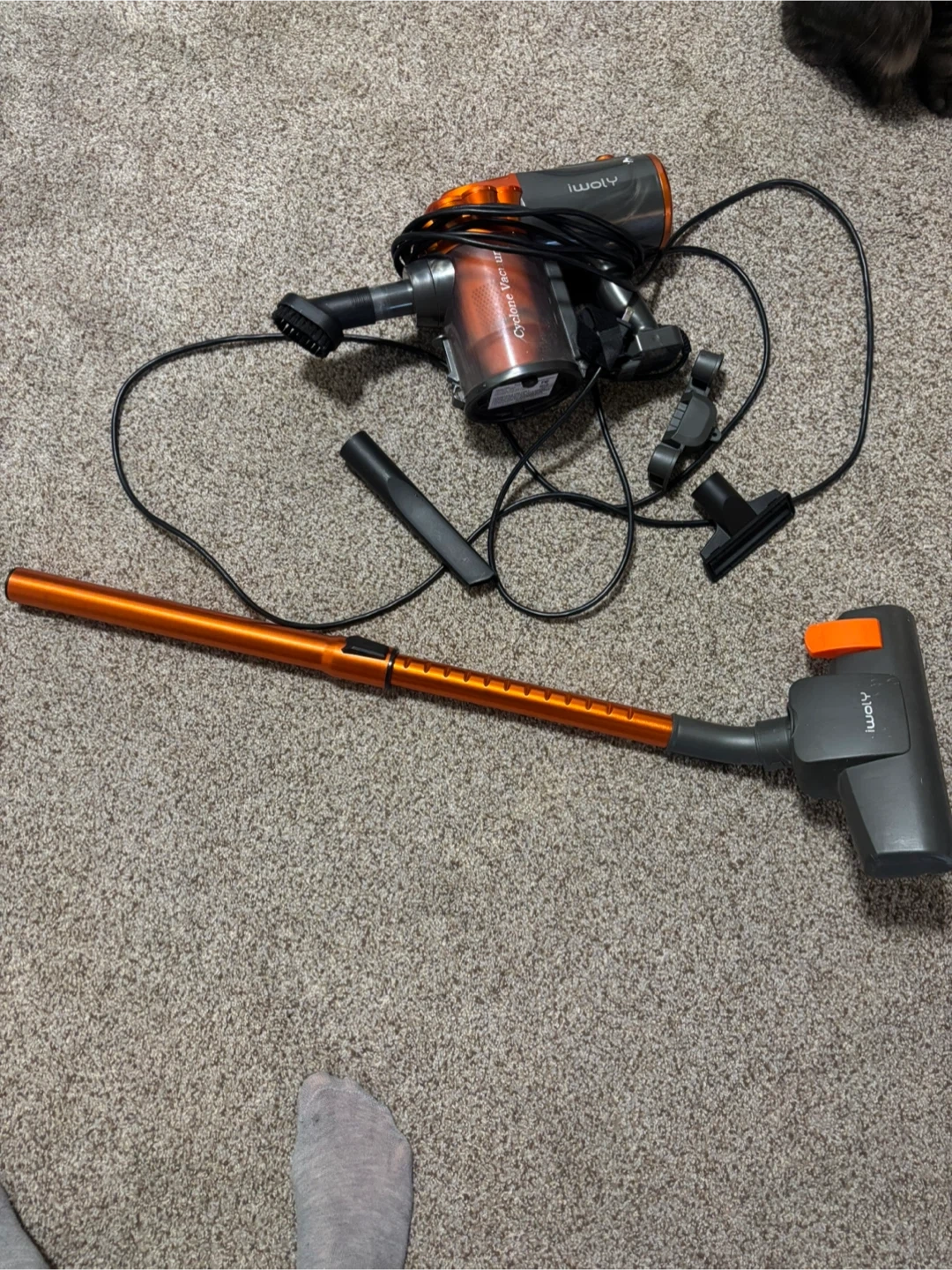 This is an Iwoly cyclone vacuum cleaner. It's lightweight and comes with a wand and attachments. The main unit is orange and grey.