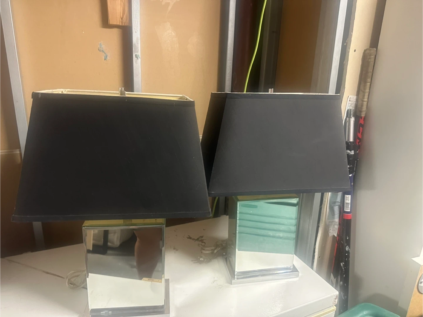Two mirrored square base table lamps are available. They each have a black fabric shade. These lamps' modern mirrored design would add a stylish touch to any room.