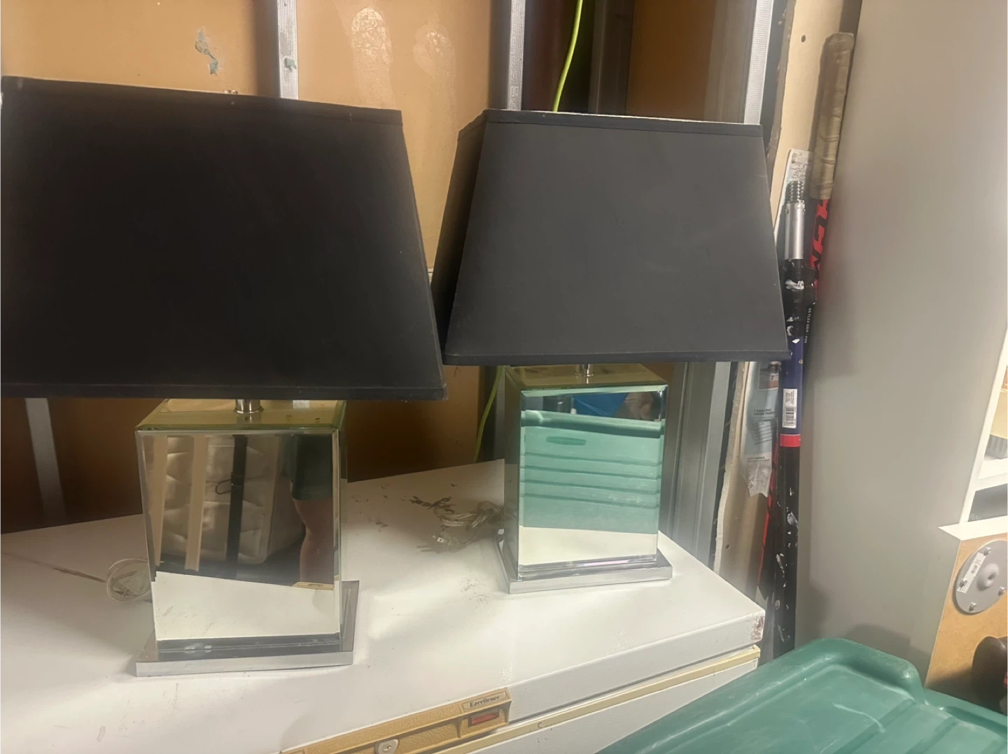 Pair of Mirrored Square Base Table Lamps with Black Shades
