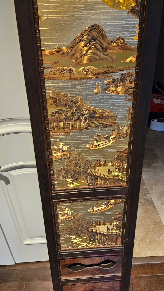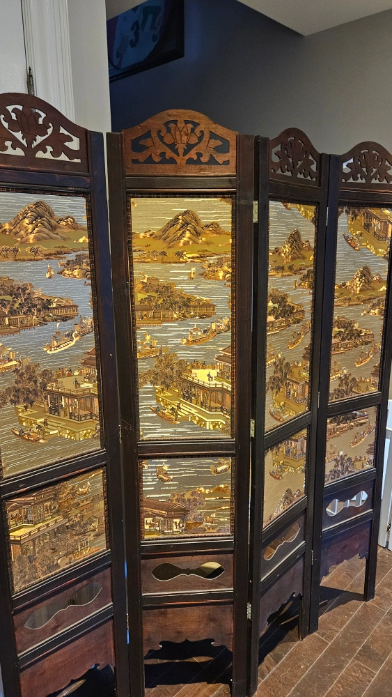 A beautiful and unique antique four panel room divider. It features a detailed design of a Chinese landscape with gold accents. It is a little wobbly but it's not too bad.