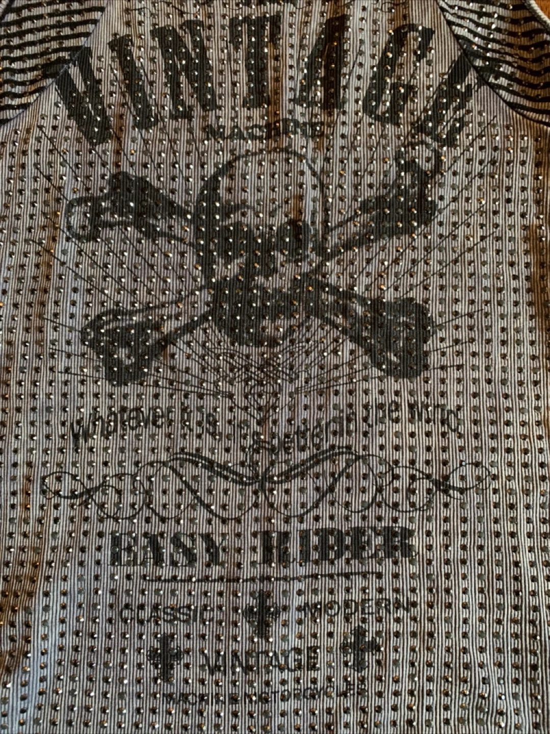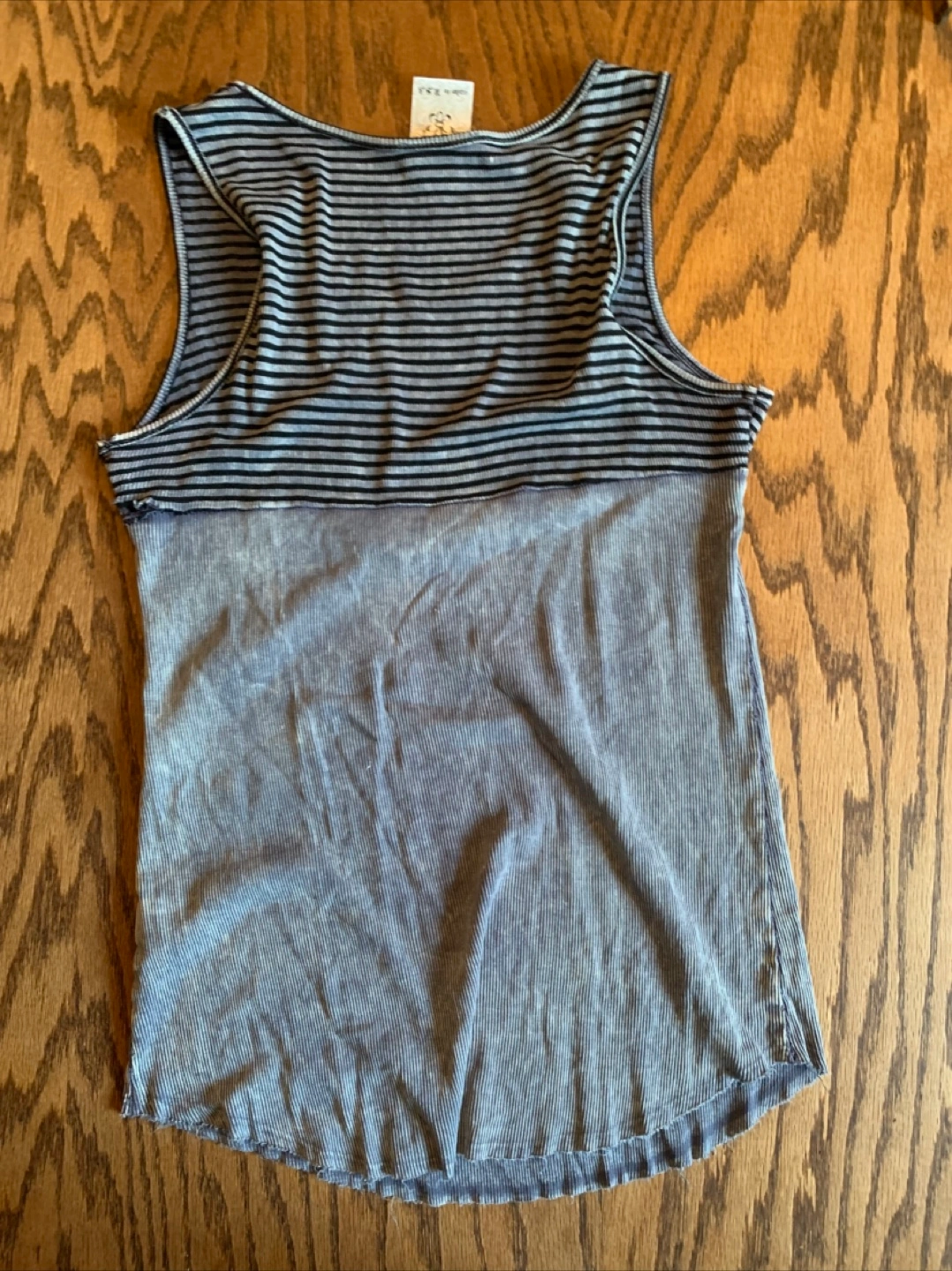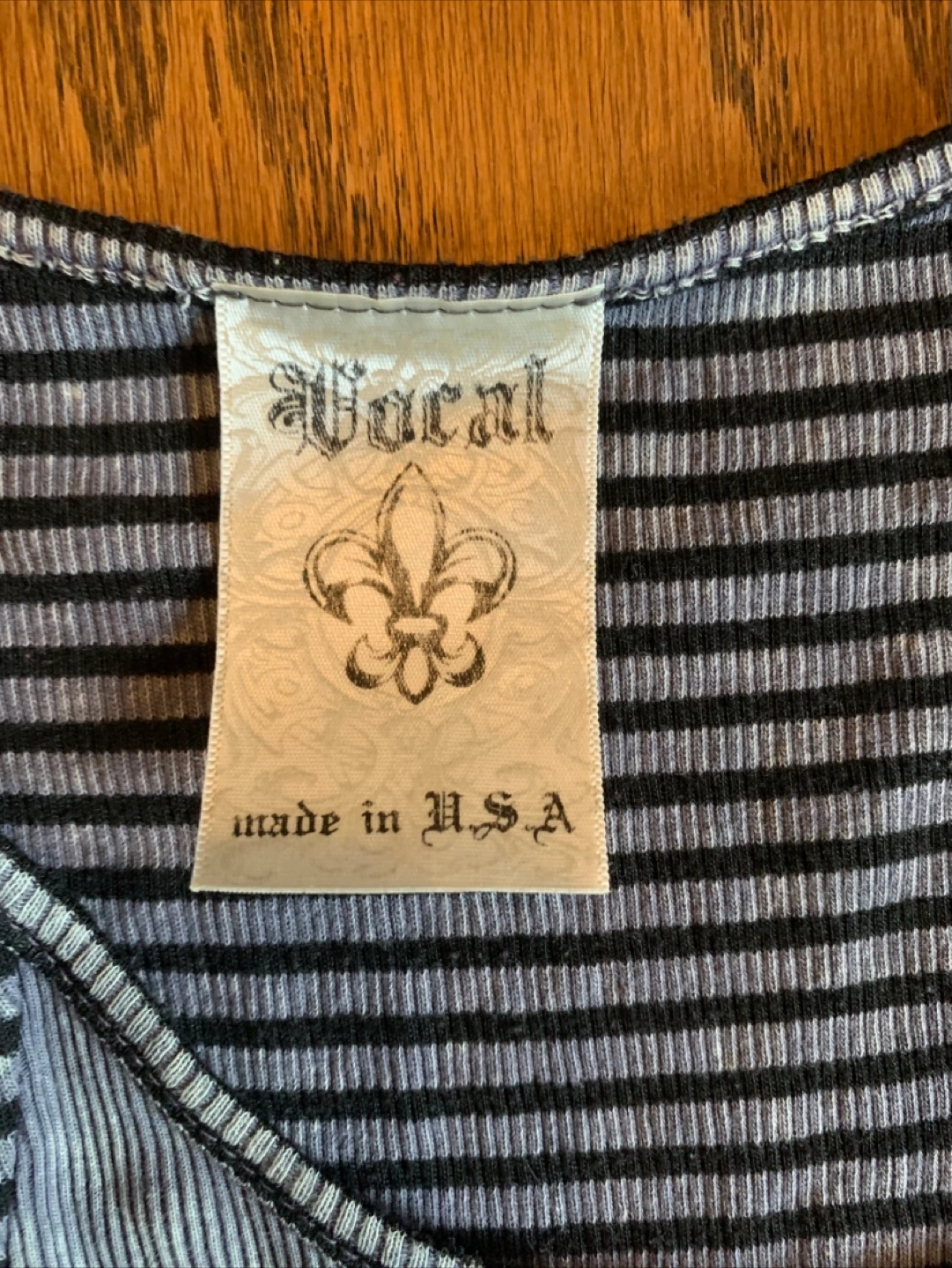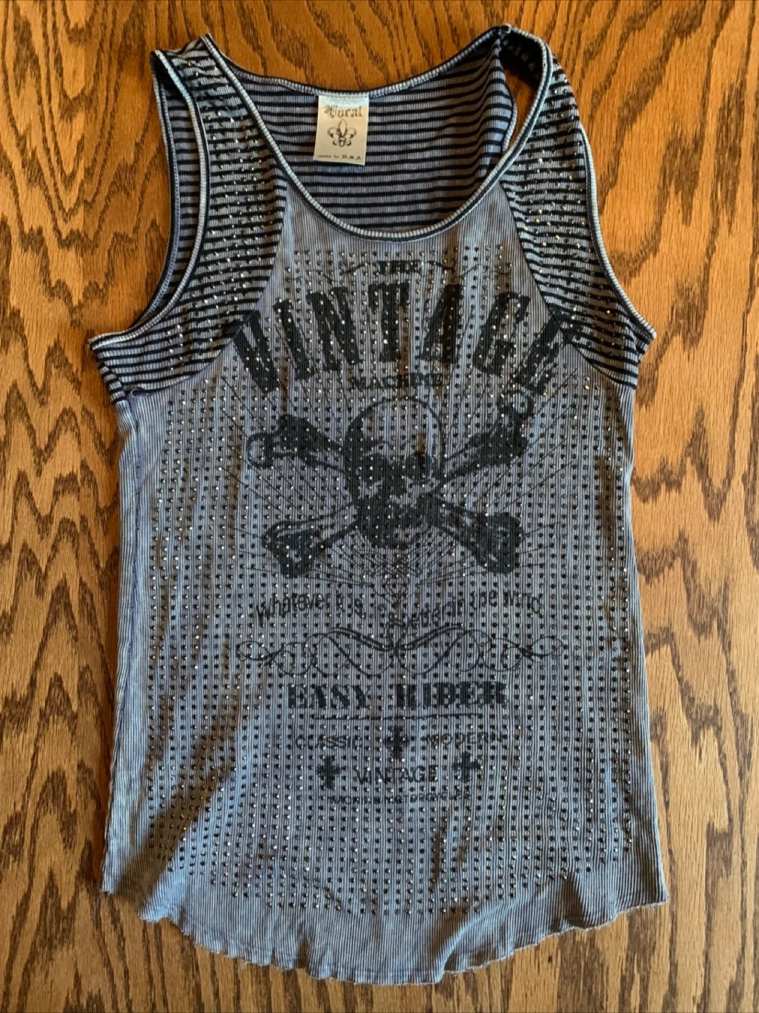 Vocal women's tank top. It's a gray and black striped tank with a skull and crossbones design. The size is a large and it measures about 17 inches across the chest.
